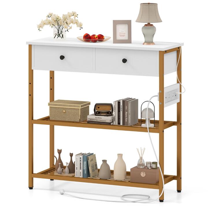 Transform your home instantly with this multi-functional entryway table! No more clutter with its 2 metal shelves and 2 drawers, topped with a sleek space for decorations. Stay charged and ready with its built-in power strip – featuring 2 AC, USB, and Type-C ports! Fear no wobbles; equipped with anti-tipping kits, this table ensures stability even on uneven floors. Elevate your home furnishing with its chic golden frame. Versatile enough for any spot – be it entryways, corridors, or your cozy coffee zone! Ready your home for elegance and efficiency! Bullet Point: Maximize Your Space with Ease: This entryway table is your ultimate organizer, boasting 2 metal mesh shelves, a generous top surface, and 2 drawers. Say goodbye to clutter and hello to a beautifully organized living room! Charging Made Simple: The console table is more than just storage – it’s your new charging hub! With a built-in power strip featuring 2 AC outlets, a USB port, and a Type-C port, keeping your devices powered up has never been easier. And the power strip can be installed at left or right at will. Stability You Can Trust: At 81cm tall, this sofa table is designed to stay put. With 2 anti-tipping kits included, you can anchor it to the wall for rock-solid stability – no wobbling or tipping over! Craftsmanship Meets Functionality: The coffee bar table features a 18mm thickened tabletop with chic golden frame, ensuring long-term quality and modern look. Plus, 4 adjustable foot pads ensure it sits perfectly on any uneven floor. Flexibility at Its Best: This narrow table is perfect for tight spaces like entryways, corridors, and behind the couch. But don’t let its size fool you – it’s also a stylish and functional coffee bar table! Specification: Color: White + Gold Material: Engineered Wood, MDF, Metal Overall Dimensions: 81 x 30 x 81 cm (L x W x H) Interior Dimensions of Drawer: 32 x 22 x 7.5 cm (L x W x H) Dimensions of Shelf: 73 x 28 x 28 cm (L x W x H) Power Cord: 150 cm AC Outlet: 220-240V/10A USB-A + USB-C: 5V/3.1A Max Weight Capacity of Tabletop: 35 kg Weight Capacity of Drawer: 5 kg Weight Capacity of Shelf: 20 kg Net Weight: 14 kg Box Qty: 1(May vary by batch) Package Includes: 1 x Console Table 1 x Instruction Manual