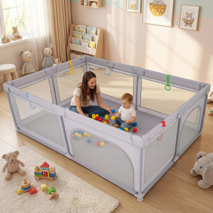 Provide a safe and secure space for children to play with this large baby playpen! The set includes 4 pull-up rings, 50 ocean balls, a hoop, and a carry bag for added fun and convenience. Wrapped in soft foam padding, with sturdy metal pipes and anti-slip suction feet, this playard is designed for safety and stability. Mesh walls allow airflow and clear views, and zip-open doors give easy access for both parents and kids. Foldable and portable, this playpen is easy to set up at home or take along for travel, meeting the needs of active families. Bullet Point: Extra Large Play Space: Measuring 81" x 57" x 27"/206 cm x 145 cm x 69 cm (L x W x H), this playpen provides ample room for babies and toddlers to crawl, play, and learn, making it perfect for active exploration. What are included: 4 pull-up rings, 50 ocean balls, a hoop, and carry bag. Wrapped in Safety: Soft foam padding on all corners and rails ensures a safe play. Made of robust and child-safe Oxford fabric, and strong metal pipes, this baby playard boosts a sturdy and stable structure. Anti-slip suction cup feet avoid tipping or sliding. Interactive Features: The 360° see-through mesh walls allow excellent airflow and a clear view, while zip-open side doors provide convenient access for both parents and kids. This thoughtful design lets you easily check on your child and encourage interactive play. Foldable & Portable Design: This portable safety fence for kids comes with a handy carry bag for effortless transport or storage. This safety fence is easy to set up at home, or on trips, making it the ideal choice for modern, on-the-go families. Promote Development: This portable baby playpen encourages self-confidence and motor skills growth while allowing parents to take a break or tend to other tasks, knowing their child is safe and happily engaged in a stimulating environment. Features: Comes with colorful ocean balls, and a hoop to encourage active play Pull-up rings promote motor development Ball toss game improves hand-eye coordination Side doors with smooth zippers enhance parent-child interaction See-through mesh walls offer a clear view to check your baby Soft foam padding on corners and rails for added safety 69 cm/27” scientific height ensures reliable stability Constructed with a sturdy metal frame and secure connection Anti-slip suction feet avoid unwanted movement Child-safe materials give parent peace of mind Included carry bag for transport or storage Foldable and space-saving when not in use Assembly needed Specifications: Color: Light Gray Material: Oxford Fabric, Metal, PP, Foam Overall Dimension: 81" x 57" x 27"/206 cm x 145 cm x 69 cm (L x W x H) Suitable Age: 0-3 Years Old Net Weight: 16.5 lbs/7.5 kg Box QTY: 1(May vary by batch) Is Assembly Required: Yes Package Includes: 1 x Baby Playpen 50 x Ocean Balls 4 x Pull-up Rings 1 x Carry Bag 1 x User Guide