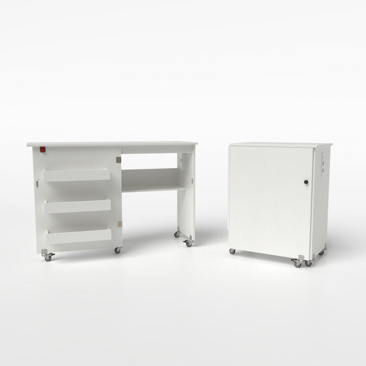 Unleash your creativity with our must-have 2-in-1 folding sewing table! This ingenious design boasts a spacious work surface that folds down into a chic storage cabinet, keeping your space clutter-free. With a built-in charging station offering multiple outlets, you can effortlessly power your devices right where you work. Stay organized with a generous open shelf and 3 handy storage trays, ensuring all your sewing tools are always at your fingertips. Plus, glide it around effortlessly! With 5 universal casters—3 lockable—this sewing machine table boasts excellent stability when you need it. And it’s not just for sewing; it doubles as a modern computer desk or stylish cabinet! Elevate your workspace experience today! Bullet Point: Space-saving 2-in-1 Design: This folding sewing table features a large work surface that conveniently folds down to transform into a compact storage cabinet when not in use. Equipped with a spring-loaded latch and anti-collision pads, it ensures smooth and effortless transitions between its different configurations. Convenient Charging Station: The craft table includes a cleverly designed charging station located on the side, freeing up valuable tabletop space. It offers multiple outlets, including 2 AC outlets, a USB port, and a Type-C port, making it easy to keep your sewing tools and other devices powered up. Ample Storage Solutions: With a spacious open shelf and 3 storage trays, this sewing machine table helps you keep your sewing tools, accessories, and other sundries neatly organized. It ensures that everything you need is within easy reach while maintaining a tidy workspace. Easy Mobility with Lockable Casters: Equipped with 5 universal casters, 3 of which are lockable, this folding sewing station allows you to move it around effortlessly. Simply step on the brakes to securely stop the cart in place, providing stability when you need it most. Versatile Functionality: This multipurpose unit is not just a functional sewing machine table; it also doubles as a computer desk or a stylish side cabinet. Its versatile design makes it a valuable addition to any home or workspace. Specification: Colour: Natural/White Material: Engineered Wood, Metal Overall Dimensions: 116 x 41 x 78 cm (L x W x H) Folded Dimensions: 58.5 x 41 x 78 cm (L x W x H) Dimensions of Tray: 37 x 11.5 x 5 cm (W x D x H) Dimensions of Open Shelf: 53 x 22 x 40 cm (L x W x H) Power Cord Length: 145 cm AC Outlet: 220-240V/50Hz/10A USB + Type-C: 5V/3A Weight Capacity of Fixed Tabletop: 20 kg Weight Capacity of Folding Part: 20 kg Weight Capacity of Shelf: 10 kg Net Weight: 19.5 kg Box QTY: 1 (May vary by batch) Package Includes: 1 x Folding Sewing Table with Power Strip 1 x Instruction Manual