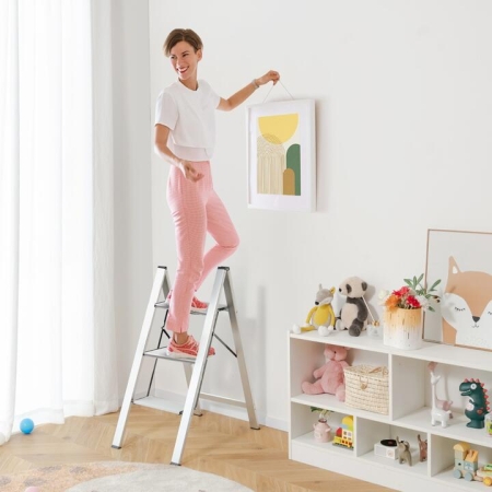 With heavy-duty aluminum pipes, the ladder provides strong support for you. The triangle structure enhances stability, ensuring each step can withstand up to 150 kg. And the folded ladder becomes only 4 cm thick, making it easy to store under furniture. Weighing just 4.5 kg, the ladder is lightweight and portable. Safety is a top priority with wide anti-slip pedals and non-slip rubber footpads. And the fastened supporting brace and safety buckle highly improve the overall stability. All in all, this multifunctional 3-step ladder will be a must-have in your daily life. Bullet Point: Sturdy Aluminum Structure: This step ladder features solid aluminum frame which is heavy-duty and rustproof. And the sturdy triangle structure strengthens the overall stability, enabling each step to withstand 150 kg. Compact Folding Size: When folded, the ladder is only 4 cm thick, which is perfect to put under the sofa or bed. Moreover, with 4,5 kg net weight, this lightweight 3-step aluminum ladder is both portable and space-saving. High-Level Safety: The wide pedals with anti-slip texture make you stand more stably. And the non-slip rubber footpads increase the friction for higher safety and protect the floor from scratches. Multi-Use Ladder: This versatile ladder will tackle multiple problems in daily life, whether you want to clean windows, change bulbs or fetch thing from high space. Plus, it’s also perfect as a storage shelf for plants or decorations. No Need to Assemble: There is no need to install, as the ladder has been fully assembled before delivery. Just expand this premium folding ladder and enjoy the convenience it brings! Features: Solid and rustproof aluminum construction for durability Sturdy triangle structure ensures stability and safety Each step can support up to 150 kg Compact folding size of only 4 cm thickness 4.5 kg light weight for easy carrying Wide anti-slip pedals for secure footing Non-slip rubber footpads protect floors and enhance safety Versatile ladder for various tasks in daily life Can double as a stylish storage shelf No need to assemble, saving time and effort Specifications: Colour: Silver Material: Aluminum Overall Dimension: 65 x 44 x 89 cm (L x W x H) Folding Dimension: 96 x 44 x 4 cm (L x W x Thickness) Weight Capacity of Each Pedal:150 kg Net Weight: 4.5 kg Gross Weight:5 kg Package Includes: 1 x Step Ladder 1 x Instruction Box Qty:1(May vary by batch)