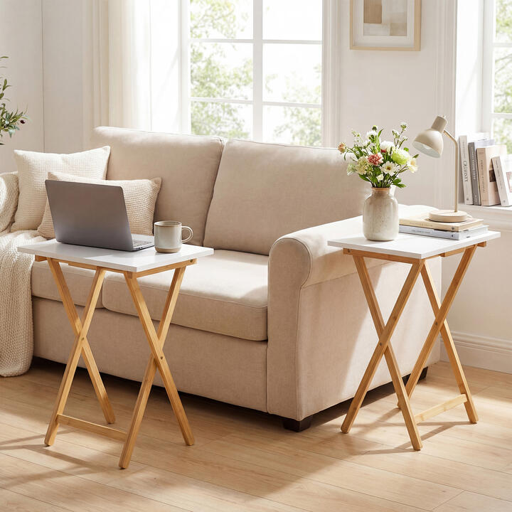 Expertly designed for space-saving efficiency, each small snack table folds down to an ultra slim size, making storage a breeze. Hence, you can simply tuck them flat beneath a sofa or bed. Gifted from nature, the 100% bamboo made sofa side table ensures long-lasting use. The sturdy X-braced legs, reinforced with crossbars, ensure solid stability and robust support for worry-free use. Weighing just 3.5kg, these lightweight tray tables are easy to carry from room to room or even outdoors, and their timeless farmhouse-inspired aesthetic seamlessly complements any interior style. These diner tray tables are versatile for sofa-side dining, laptop work, or bedside convenience. Moreover, assembly is fast and hassle-free. The smooth, water-based painted surface resists stains and wipes clean in seconds, making this set an ideal choice for functional elegance anywhere in your home. Solid Bamboo Build: Crafted from 100% solid bamboo, the folding tv tray table features robust X-braced legs and 2 added crossbars, ensuring unrivaled stability as you enjoy meals. Additionally, the resilient strap under the tabletop will fasten the support frame from displacement. Space-saving Folding Design: When the gathering is over, the sofa side table set of 2 folds seamlessly to compact size, allowing effortless storage flat under a couch, bed, or cabinet, so you can instantly reclaim your living space. Versatility in Different Settings: With a spacious 48 x 35 cm surface positioned at a comfortable 64 cm height, the wood tray tables set of 2 are perfect for dining at your couch, working in bed, or even offering convenient support beside hospital beds. Portable & Lightweight Structure: Weighing just 3.5kg each, the snack table set of 2 can be carried effortlessly in one hand, letting you transition from living room to bedroom or other indoor occasions. Also, its minimalist design elevates any interior styles. Quick Setup & Easy Cleaning: The tv dinner tray table set of 2 requires just 2 simple steps to assemble without no extra tools. Moreover, the wood surface features a water-based painting that wipes clean in seconds. Specification: Color: White + NaturalMaterial: BambooProduct Dimensions: 48 x 35 x 64 cm (L x W x H)Folding Size: 72 x 48 x 4.5 cm (L x W x H)Weight Capacity: 20 kgTotal Net Weight: 7 kgEach Table Net Weight: 3.5 kgBox QTY: 1(May vary by batch)Is Assembly Required: Yes Package Includes: 2 x Folding Snack Table1 x Users' Manual