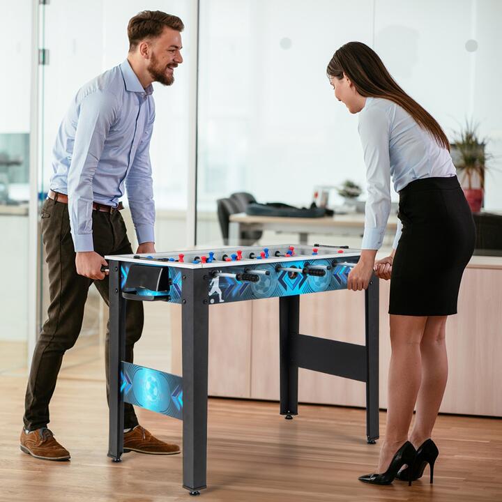 Looking for a thrilling foosball experience? This high-quality table delivers. With its cool pattern design, colourful soccer players, and realistic field, every detail is crafted for an authentic gaming experience. You'll feel like you're right on the field with friends and family. But it's not just about the fun – it's also easy to use. The comfortable grip handle ensures smooth control, while the non-slip design enhances precision. The adjustable leg leveller allows for easy height adjustment and stability on any surface. Besides, this foosball table is perfect for parties, family activities, or friendly office competitions. It offers endless fun and bonding opportunities. Additionally, the 4 supportive legs and non-slip footpads keep it steady during intense gameplay. Plus, the clear score counter and convenient goal box add excitement to each match. It's the perfect opportunity for family interaction and quality time together. Bullet Point: Enjoy Real Game Experience: Immerse yourself in the thrilling world of foosball with this high-quality table. From the cool pattern design, and colourful soccer player figurines to the realistic soccer field, every detail is designed to provide an authentic gaming experience. Easy Operation & Adjustment: The comfortable grip handle ensures smooth control and better ball handling. And the non-slip design enhances your precision and accuracy. Additionally, with the adjustable leg leveller, you can easily adjust the height and maintain stability even on uneven surfaces. Suitable for Various Occasions: Whether you're hosting a party, organizing family activities, fostering family interactions, or having a friendly game competition at the office, this foosball table game is the perfect choice. It offers endless fun and bonding opportunities for everyone involved. More Exquisite Details: This foosball table is crafted with a stable structure and premium materials to ensure long-lasting durability. The 4 supportive legs and nonslip footpads keep the table steady during intense gameplay. The clear score counter and convenient goal box add convenience and excitement to your matches. Family Interaction Game: Bring the family together and enjoy quality time with this foosball table game. Not only does it provide entertainment and endless fun, but it also promotes intellectual development, logical thinking ng, and hand-eye coordination, and strengthens the parent-child relationship. Features: The handles with non-slip design for better ball control Adjustable leg leveler adjusts the height and helps to maintain stability on uneven surface The crossbar is designed for added stability during intense action Realistic game experience with cool pattern design and colourful soccer players Suitable for various occasions like parties, family activities, and office competitions Sturdy structure and premium materials ensure durability and stability A clear score counter and convenient goal box add excitement to each match Promotes intellectual development, logical thinking, and hand-eye coordination Perfect for family interaction and quality time together Specifications: Colour: Black Material: MDF + Metal + PP Overall Dimension: 94.5 cm x 53.5 cm x 76.5 cm (L x W x H) Foosball Table Dimension: 87.5cm x 45.5 cm Net Weight: 10.5 kg Package Includes: 1 x Table Base 2 x Football 18 x Football Player 1 x User Guide Box Qty:1(May vary by batch) Is Assembly Required: Yes