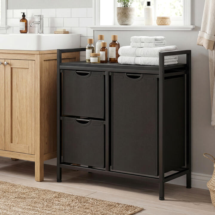 Looking for a versatile laundry organizer that combines functionality and style? This laundry hamper is the perfect solution. With partitioned storage space and two medium baskets (18L) and one large basket (39L), you can easily sort your clothes by color or type. The solid bottom support ensures no sagging, providing stability and peace of mind, while the convenient pull-out design makes storing and accessing your clothes a breeze. And ours with its water-repellent coating and easy-to-clean surface, maintenance is effortless. Moreover, with adjustable foot pads and a sturdy construction, it's designed to withstand everyday use. Hence, it is perfect for any space, including the laundry room, bedroom, bathroom, or walk-in closet. Upgrade your laundry routine with our innovative and stylish laundry hamper today. Bullet Point: Partitioned Storage Space: This laundry basket offers ample room to sort your dirty clothes by color or type. It includes two medium baskets, each with a capacity of 18 L, and one large basket with a capacity of 39 L. Plus, it has a wide tabletop for you to place more items. Solid Bottom Support: Vary from others hampers, this laundry hamper features a unique bottom panel design, providing solid support and ensuring no sagging when the laundry bags are full. You can now trust that your clothes will be stored securely without any worry of the hamper collapsing. Convenient Pull-out Design: Designed with pull-out bags, this laundry organizer makes it incredibly convenient to store and access your clothes. Besides, the hook and loop fasteners allow you to attach and detach the bags easily. Wide Application and Easy Maintenance: This versatile laundry organizer is perfect for any space, including the laundry room, bedroom, bathroom, and even walk-in closets. Additionally, the water-repellent coating protects the bags from potential stains and allows you easy to clean the surface. More Exquisite Details: The adjustable foot pads ensure stability on any surface, while the convenient handle design makes it easy to move around as needed. What’s more, the thickened and rustproof metal tubes make the whole frame sturdy and durable. Features: Partitioned storage for easy sorting clothes of different colors(light or dark) Solid bottom support prevents sagging and ensures stability Convenient pull-out design for quick and easy access to clothes Hook and loop fasteners for effortless attachment and detachment of bags Wide application in laundry rooms, bedrooms, bathrooms, and walk-in closets Water-repellent coating protects against stains and allows for easy cleaning Adjustable foot pads for stability on any surface Sturdy construction with thickened and rustproof metal tubes for durability Convenient handle design for easy transportation of the hamper Specifications: Color: Black + Rustic Brown Material: Metal + P2 Engineered Wood + Oxford Fabric Overall Dimension: 65.5 cm x 33 cm x 72 cm (L x W x H) Big Liner Bag Dimension: 30 cm x 26 cm x 50 cm (L x W x H) Small Liner Bag Dimension: 30 cm x 26 cm x 23 cm (L x W x H) Net Weight: 7 kg Package includes: 1 x Laundry Hamper 1 x User Guide Box Qty:1(May vary by batch)