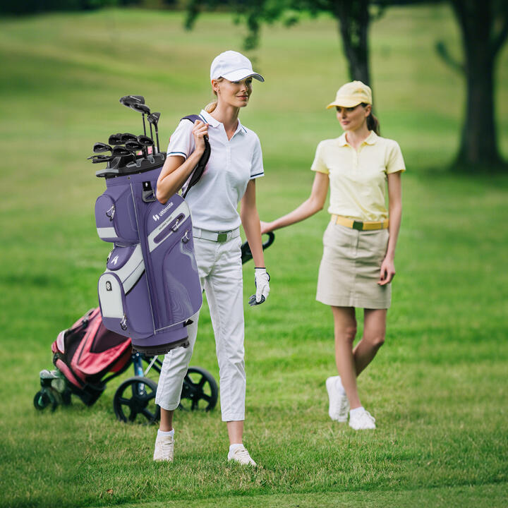 Designed with a 14-way molded lock top with dividers, this golf bag offers excellent organization and separation of your clubs, ensuring they are securely held and easy to access. It features a total of 11 pockets, providing ample space for all your essential accessories. These include 2 lined valuables pockets to keep personal items safe and a cooler bag to keep your beverages chilled throughout the day. Crafted to cater to every golfer's needs, this golf club bag is lightweight and comes with a padded strap and multiple handles, making it effortless to carry around the golf course. Additionally, the golf bag includes a towel ring, glove holder, pen pouch, rain hood and umbrella holder for convenient use. Bullet Point:14-Way Divider Top: Featuring 14 dividers with molded club locks, this golf cart bag ensures each club is securely held in place as well as prevents rattling and collisions. Please note that golf clubs are not included. Sufficient Storage Space: This golf bag offers ample storage with a total of 11 pockets, including 2 front pockets, a cooler pocket, 2 small pockets, 2 soft-lined valuables pockets, 2 side pockets, and 2 pockets. It keeps all your essentials organized and easily accessible. Effortless Carrying: Equipped with an adjustable padded shoulder strap and multiple carrying handles, this lightweight golf cart bag allows you to easily transport your clubs and accessories around the course. All Weather Protection: This golf cart bag comes with a rain-proof and sun-proof zippered rain hood that can protect your clubs from the elements. Besides, the inclusion of the umbrella holder keeps you prepared during sudden rains. Added Convenience: To enhance your golfing experience, this golf bag includes a towel ring, glove holder and pen pouch, providing quick access to everything you need. Plus, there is an extra pocket at the back to neatly store the shoulder strap when not in use. Specifications:Colour: As shown in the pictureMaterial: Polyester Fabric, PlasticBag Height (with Rain Hood): 127 cm Bag Height (without Rain Hood): 90.5 cm Top Dimensions: 34 cm x 24 cm (L x W)Base Dimensions: 27 cm x 27 cm (L x W)Net Weight: 2.6 kg Package Includes:1 x Golf Cart Bag1 x Rain Hood Box QTY: 1(May vary by batch) Is Assembly Required: Yes