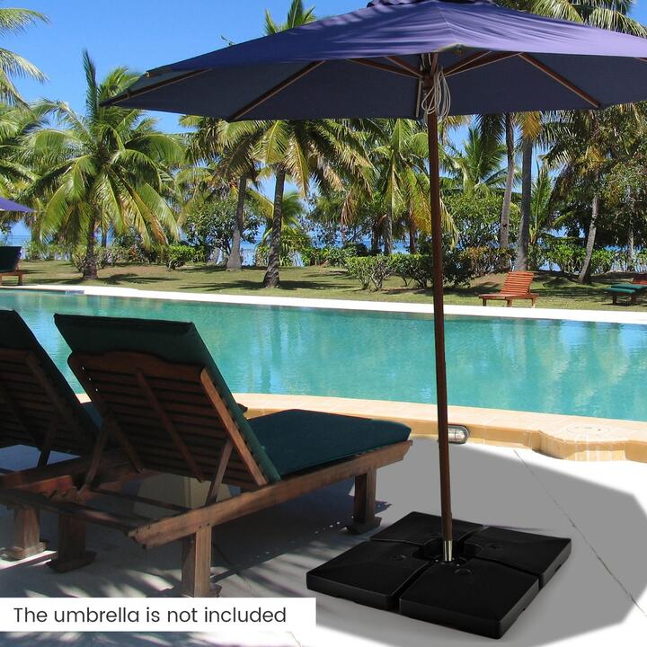Keep your patio umbrella stable with our offset umbrella base! Crafted with high-quality HDPE material, which is weather-resistant and not easily deformed, our 4 pcs square umbrella base can last for a long time. The 4 separate plates requires tool-free assembly to fit your umbrella cross bar base(not included). With convenient spout, each plate can fill 20 L water to make the umbrella base heavier, thus providing stable support for your cantilever umbrella. But the empty umbrella base is incredibly lightweight. And there is a hidden handle to make it easy to carry around for commercial events or weddings. With thoughtful details, there are circulation holes to keep bottom dry. Moreover, the weighted umbrella base set can be stored in corners due to the stackable design. Bullet Point: High Strength & Durable Material: Constructed of all weather resistant HDPE, the 4 pieces umbrella base set is not easy to crack or fade in any weather conditions. Likewise, the rugged material is deformation resistant for long-term use. 4 Pieces Large Square Plates: The offset umbrella base consists of four 51 x 51 x 12 cm plates, which can be simply put together to fix your cross bar base(not included). The flexible design requires no tools for assembly, which is a great convenience. Fillable Base Adds Stability: Each plate can be filled with 20 L water or 27 kg sand to add weight of the base. Therefore, the weighted umbrella base can provide powerful support for your cantilever offset umbrella to endure strong winds. Easy to Use & Store: With an easy-to-fill spout, the heavy umbrella base can be simply filled and emptied by unscrewing the cap. In addition, when not in use, the 4 detachable plates can be stacked to save space. Portable & Lightweight Design: Each empty plate only weighs 2.5 kg, which is effortless for you to move. Besides, built-in handle enables you to transport the patio offset umbrella base to garden, yard, poolside conveniently. Feature: Premium HDPE material is non-fading and crack-resistant Providing 80 L large water filling capacity Fill and empty the umbrella base easily with spouts Each plates can be stacked up to save space Easy to transport & store with hidden handle and stackable design Multiple holes keep bottom dry Suitable for various occasions like patio, garden Assembly is easy without tools Specifications: Color: Black Material: HDPE Size of Each Plate: 51 x 51 x 12 cm (L x W x H) Total Fill Capacity of the Sand: 108 kg (27 kg Per Plate) Total Fill Capacity of the Water: 80 L (20 L Per Plate) Total Fill Capacity of the Water & Sand: 128 kg (32 kg) Total Weight Capacity: 90 kg Net Weight: 10 kg Package Includes: 1 x Umbrella Base 1 x User's Manual Box Qty:1(May vary by batch)