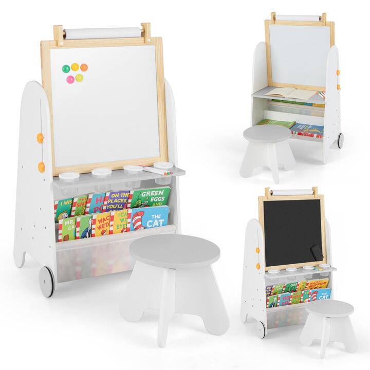 Featuring a double-sided magnetic whiteboard and blackboard, this multifunctional activity table meets various needs of children. The bookshelves and an additional storage shelf provide large storage capacity. The set also includes paint cups, chalks, an eraser, and a paper roll, making it a perfect gift for young artists. Easy to move around with rolling wheels, this set provides endless opportunities for imaginative play and skill development. Bullet Point: 4-in-1 Multifunctional Design: This innovative setup includes a double-sided art easel—magnetic whiteboard on one side and blackboard on the other—along with a drawing paper roll and a study table. Easel dimension: 42 cm x 56 cm x 92-105 cm (L x W x H). Seat dimension: 28 cm x 28 cm x 28.5 cm (L x W x H). Adjustable Height and Easy Mobility: With a height adjustable from 92 cm to 105 cm, this standing easel can accompany the growth of your child. Equipped with rolling wheels, the easel can be moved effortlessly around your home, ensuring creative fun is never out of reach. Convenient Storage: This kids activity desk is designed with ample storage options, including paint cups, bookshelves, and a lower storage shelf, keeping all art supplies organized and within easy reach. Kid-Friendly Features: This standing art easel for kids is built with a stable A-shape structure and complies with ASTM and CPSIA, providing a secure platform for young artists. Moreover, smooth rounded edges avoid injuries while in use. Great Gift for Your Little One: Perfect for drawing, writing, learning, playing, and various activities, this art easel and stool set helps inspire and unleash creativity of children. The set includes a paper roll, 5 chalks, a eraser, and 4 paint cups. Specifications: Colour: Grey + White + Natural/White + Natural Material: Pine Wood Art Easel Dimension: 42 cm x 56 cm x 92-105 cm (L x W x H) Whiteboard/Blackboard Dimension: 42.5 cm x 41 cm Tabletop Dimension: 49.5 cm x 26 cm x 40 cm (L x W x H) Seat Dimension: 28 cm x 28 cm x 28.5 cm (L x W x H) Paper Roll Length: 3 m Weight Capacity of Stool: 75 kg Suitable Age: 3+ years old Net Weight: 10 kg Package Includes: 1 x Kids Art Easel with Stool 5 x Chalk 1 x Eraser 4 x Paint Cups 1 x User Guide Box Qty:1(May vary by batch)