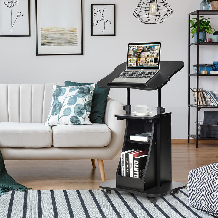 Are you looking for a desk that can stand or sit freely for increased productivity at home or in the office? This sit-to-stand laptop desk is your wise choice. The height of the desk is adjustable from 72cm to 120cm by turning the knob, which brings you a lot of convenience in customizing your personal workspace. The tiltable desktop keeps monitors at eye level to minimize fatigue while adding extra storage space. There is also an anti-skid stripe to prevent items from falling. With an open shelf and 2 open compartments, the standing desk helps you organize your books, documents and office supplies. Thickened boards and heavy-duty steel frame make it stable and not easy to shake. Thanks to 4 smooth wheels(2 wheels are lockable), you can move it anywhere you want. Bullet Point: Ergonomic Height Adjustment: The height of this laptop stand can be adjusted from 72cm-120cm to meet your different needs. It allows you to switch between sitting and standing modes for a healthier working style. Moreover, you can tilt the desktop in the range of 0°-180°(Recommend 45°) to keep your eyes in a comfortable view. Large Work Space: Featured with 40cm wide and 55cm in long desktop, the sit-to-stand desk creates a spacious and efficient work area. The open shelf provides extra space to display cups and decorations. Additionally, 2 storage compartments accommodate a great amount of office supplies, such as books, files and more. The anti-skid stripe to prevent items from falling. Smooth Rolling Wheels: This laptop stand is designed with 4 universal wheels, which ensures outstanding mobility for easy movement. You can move it anywhere you want without effort as needed. Additionally, 2 wheels are lockable for safe placement and extra convenience. Modern Look for Multiple Scenes: The combination of modern style and functional utility enables the standing desk to be an ideal addition to your space. It blends with existing furniture and ornaments. And it can be used for work, study and lectures in the office, home and classroom. Features: Adjustable height improves your sitting or standing posture Wide desktop offers ample room for laptops and other necessities Open shelf and 2 open storage compartments for convenient storage Barrier stripe avoids accidental slipping of items Thickened boards and sturdy steel frames ensure durability Flexible wheels (2 lockable wheels for safety) make it easy to move anywhere Sleek look brings a touch of elegance to your home and office Specifications: Color: Black Material: MDF, engineered wood Overall dimension: 55cm x 40cm x 72-120cm(L x W x H) Net weight: 12kg Weight capacity of desktop: 15kg Package includes: 1 x Standing desk 1 x Instruction manual Box Qty:1(May vary by batch) Is Assembly Required: Yes