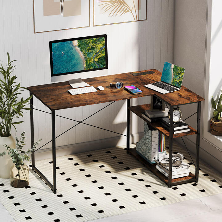 Transform your space! Unlock the secret to a supercharged, organized workspace with our L-shaped corner computer desk, designed to power up productivity! The computer workstation has a built-in power strip for charging convenience, ample storage with 2 side shelves, and a sturdy design that stands the test of time. Plus, the reversible design and 3-position adjustable shelf provides a customizable solution. Ready for anything, from high-stakes gaming to intensive studying, this office desk is a game-changer for bedrooms, dorms, and home offices. Need a sleek command center that handles it all? Grab this multifunctional desk and elevate your environment in style! Bullet Point: Power Up Your Workspace: Get ready to streamline your setup with the functional L-shaped desk! It features a versatile built-in power strip with 2 AC outlets, a USB port, and a Type-C port – perfect for keeping all your devices charged and ready to go. Customize Your Storage: This office desk includes 2-tier open shelves to keep your tabletop free from clutters. The middle shelf has 3 adjustable positions, and it can even be removed to free up space for your computer tower. Maximize Your Space: Make the most of every corner with this corner desk! Its reversible storage shelves offer 2 installation ways, so you can easily adapt it to fit your room’s layout and maximize your workspace. Built to Last: Need a computer desk that can handle the weight of your work? This heavy-duty metal frame is reinforced with dual X-shaped structures and adjustable foot pads for rock-solid stability and long-lasting support. Unleash Your Creativity: Whether you’re gaming, working, or studying, this versatile PC desk is your go-to solution! It’s perfect for bedrooms, dorms, home offices, or anywhere you need a versatile and stylish workspace. Specification: Color: Rustic Brown + Black/Black/Grey + Black/White Material: Engineered Wood, Metal Overall Dimensions: 118 x 86 x 74 cm (L x W x H) Dimensions of Left Panel: 88 x 58 cm (L x W) Dimensions of Right Panel: 86 x 30 cm (L x W) Dimensions of Shelf: 80 x 26 cm (L x W) Space Between Bottom Shelf and Top: 66 cm Adjustable Clearance of Shelf: 10 cm Power Cord Length: 150 cm AC Outlet: 220-240V/10A USB + Type C: 5V/3.1A 15.5W Weight Capacity of Tabletop: 110 kg Weight Capacity of Shelf: 15 kg Net Weight: 16.5 kg Box QTY: 1(May vary by batch) Package Includes: 1 x Corner Desk 1 x User Manual