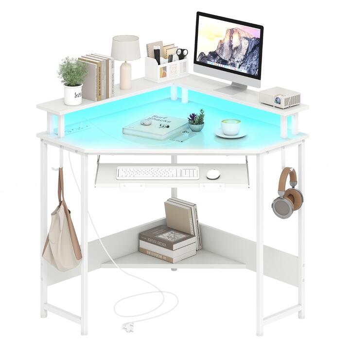 Crafted with a space-saving design, this unique desk fits perfectly into corners, ensuring no wasted space. Utilize your room corners to their full potential, leaving more room for other furniture. Unlike others, ours features a convenient built-in charging station with 2 AC outlets (220V-240V / 10A), 1 USB ports and 1 type-c port(5V / 3.1A), eliminating the need for messy extension cords and scattered chargers. The spacious desktop provides ample room to comfortably work on your computer, monitor, and other essential equipment. Keep your workspace organized and clutter-free with the extra storage shelf and 2 hooks provided by this corner desk. User-friendly details showcase better workmanship: it also comes with built-in LED lights, which can beatify your indoor space. Adapt this versatile desk to different settings and requirements – whether you need it for your home office, study room, or bedroom. Upgrade your workspace and enjoy the benefits of this efficient and sleek corner desk. Space-saving Corner Desk with LED: Make the most of your limited space with this triangular table. This unique design is specifically crafted to fit perfectly into corners, ensuring no wasted space. Moreover, this corner computer desk also comes with 20 static color and 22 dynamic modes of lighting, which can decorate your room. Built-in Charging Station: Do away with the hassle of messy extension cords and scattered chargers. This corner desk is equipped with a convenient built-in charging station, making it a perfect fit for our modern digital lives. With 2 outlets, one USB ports, and one type-C port, you can easily charge your devices while working. Ergonomic Monitor Stand and Keyboard Tray: Our uniquely designed monitor stand can hold two monitors, ensures that your line of sight and your monitor are always parallel when you sit at this computer desk. Moreover, it also features a 3-position adjustable keyboard tray, protecting your spine's health. Reliable Construction: This corner desk is constructed of heavy-duty metal frame for a reliable overall structure. In addition, the table comes with adjustable foot pads that can keep the table balanced as well as protect your floor. For your convenience, the easy-to-clean surface is smooth and water-proof, saving your time and energy. Adequate Storage Space: The spacious desktop ensures you have plenty of room to work comfortably, accommodating your computer, monitor, and any other essential equipment. You can efficiently organize your workspace and keep clutter at bay with the additional bottom shelf and 2 side hooks provided by this corner desk. Specifications: Colour: Black/White Material: Engineered Wood, Metal Overall Dimensions: 80 x 80 x 88 cm (L x W x H) Length of Tabletop: 72 cm Width of Monitor Stand: 15 cm Height of Monitor Stand 12.5 cm Width of Tabletop: 30 cm Size of Key Board Tray: 60 x 26 cm (L x W) Size of Bottom Shelf: 43 x 43 cm (L x W) Height of Bottom Shelf: 12.5 cm Height of Tabletop: 76 cm Weight Capacity of Tabletop: 90 kg Net Weight: 17 kg Box QTY: 1 (May vary by batch) Package Includes: 1 x Corner Computer Desk 1 x Instructional Manual