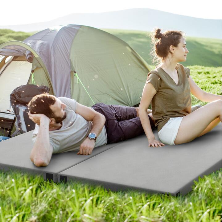 With a multi-layer design including waterproof short plush cover, 42D memory foam, and 30D high-density foam, this pad ensures less sink when side sleeping and no pain when front sleeping. The anti-slip bottom cloth provides additional safety for worry-free use. This camping mattress serves as an indoor yoga mat, car mattress, or the perfect companion for outdoor adventures. Hence, it is perfect for living room, camping or jungle exploration use. Bullet PointSuper Comfortable Camping Pad: This outdoor camping mat is designed with multi-layer including a waterproof short plush cover, 42D memory foam, and 30D high-density foam that ensures less sink when side sleeping and no pain when front sleeping. Plus, the anti-slip bottom cloth ensures safe use. Foldable Design and Easy Carrying: When not in use, this sleeping bed can be easily folded into a compact size. Just roll up the mat, fasten it with the straps, and conveniently place it into the backpack. Then you can take it anywhere! Wide Application: This camping mattress serves as an indoor yoga mat, car mattress, or ideal camping mattress for outdoor adventures. Its can be widely used in living room, camping or jungle exploration. More User-friendly Designs: Featuring hook and loop fasteners on the side, this camping mattress allows you to connect more mats. Besides, the machine washable cushion cover comes with a zipper design, making it easy to clean and saves your energy. 3 Sizes Available: This outdoor camping mat features 3 different sizes. You can choose from single (small) 183 x 62.5 x 6.5cm(L x W x T), single 188 x 78 x 6.5 cm(L x W x T)or twin 188 x 97 x 6.5 cm(L x W X T)to suit your needs. Specifications:Color: Grey/ BlueMaterial: Short Plush Fabric, FoamOverall Dimension: 188 x 78 x 6.5cm(L x W x H)Folding Dimension: 41 x 78cm(D x H)Net Weight: 4 kg Package Includes:1 x Memory Foam Camping Pad1 x Carrying Bag1 x User Guide Box Qty:1(May vary by batch)