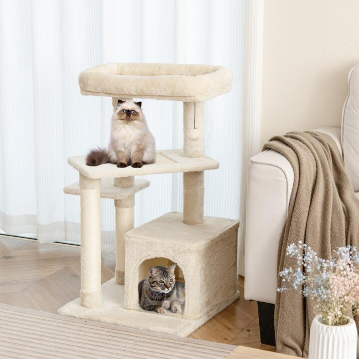 This cat tree has a ladder design with a private condo, 2 platforms, and a tall perch. Several cats can rest and have fun on this cat tree. And the wooden structure is pretty stable for kittens to jump around. This cat tree prepares sisal posts and sisal-covered platforms for cats to stretch their paws and sharpen their claws. The cat condo is covered with high-quality plush fabric to create a warm and snuggling house. It requires simple manual steps with detailed instructions. Cat Playing Activity Center: This cat tree has several resting and playing sections—a private condo allows cats to hide and daze; a tall perch let the cat look over his surroundings, and platforms guarantee the kitten has jumping footholds. Moreover, there is a hanging toy to arouse cats’ interests for numerous enjoyments. Comfortable Flocked Design: The cat tower is carpeted with a soft flock for fluff texture and elevated comfort. The top perch is also equipped with a cat bed for kittens to rest in coziness and warmth. The whole tower has no sharp edge and is safe for kittens to jump around. Stable Cat Tower: This cat playing center is supported with 3 bearing columns, each measuring 6.5 cm thick. That design enables the cat tree to have 2-3 cats to play around with the perch of 10 kg limitation and each platform 10 kg. And the wooden structure is stable and trustworthy. Sisal Elements on Post and Platform: To prevent the paws from ruining your furniture, this cat tree is equipped with sisal posts for proper claw-grinding areas. And the middle platform is also paved with a sisal area, allowing cats to enjoy scratching in different postures. Easy Assemble and Dimension: Following the manual guidance step by step, it is easy to put the pieces together for a brand-new cat tree tower. It measures 63 x 56 x 85 cm (L x W x H), cat condo size is 30 x 38 x 28 cm (L x W x H). Specifications:Colour: Gray/BeigeMaterial: Particle Board, Sisal, PlushOverall Dimensions: 63 x 56 x 85 cm (L x W x H)Base Size: 50 x 50 cm (L x W)Cat Condo Size: 30 x 38 x 28 cm (L x W x H)Net Weight: 10 kgWeight Capacity of Each Tier: 10 kgTotal Weight Capacity: 40 kg Package Included:1 x Cat Tree1 x Accessories Bag1 x User’s Manual Box Qty:1(May vary by batch)