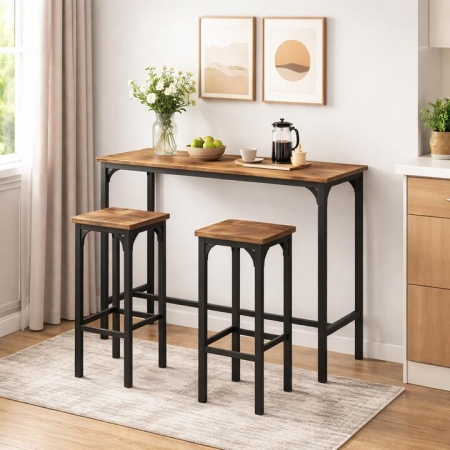 This industrial counter height bar table and stool set is designed to bring both functionality and style into your home. Featuring a narrow long bar table paired with two compact counter height stools, the set is perfect for creating a cozy breakfast nook, casual dining area, or home bar atmosphere. Crafted with sturdy powder-coated metal frames and engineered wood surfaces, the table and stools provide reliable stability and durability for everyday use. Reinforced triangular structures, adjustable foot pads, and non-slip feet help keep the set balanced while protecting your floors. BulletPoint: Complete Counter Height Dining Set: This bar furniture set includes a narrow long bar table and 2 industrial-style counter height stools, creating a functional and stylish home bar or dining solution for kitchens, apartments, and small living spaces. Strong & Stable Metal Construction: Both the bar table and stools feature powder-coated metal frames for enhanced durability. The stools support up to 150 kg, while the table offers a strong load capacity of 200 lbs, with reinforced triangular structures ensuring long-term stability. Space-Saving & Apartment-Friendly Design: The compact stools (30 x 30 x 71.5 cm) are designed to fit neatly under counters or the table when not in use. The narrow, long bar table maximizes usable space, making this set ideal for small apartments or limited areas. Comfortable & Thoughtful Details: The bar stools feature smooth rectangular seats, rounded edges for safety, and footrests at two height levels (18 cm / 28 cm) for improved comfort. The table includes a bottom footrest with 8 inches of ground clearance, allowing you to relax your legs while seated. Versatile Industrial Style & Easy Maintenanc: With rustic wood grain surfaces and black metal frames, this set blends industrial and modern aesthetics. The smooth, stain-resistant surfaces are easy to clean, and all components come with clear instructions for quick assembly. Specifications: Counter Height Stools Colour: Rustic Brown & Black Material: Metal, Engineered Wood Overall Dimension: 30 x 30 x 71.5 cm(L x W x H) Height of Footrest:18, 28 cm Net Weight: 7.5 kg Weight Capacity of Each Stool: 150 kg High Bar Table Colour: Rustic Brown Material: Steel, Engineered Wood Overall Dimensions: 120 cm x 40 cm x 100.5 cm (L x W x H) Load Capacity: 91 kg Net Weight: 12 kg Is Assembly Required: Yes