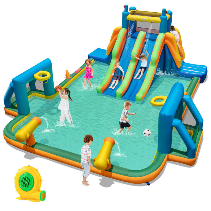 This inflatable park features 2 long slides that provide exhilarating rides for kids. With a large splash pool and 2 water guns, the excitement never stops. But wait, there is more! This wet and dry combo bounce house also includes 2 soccer gates and basketball rims for friendly sports competitions. 2 climbing walls provide a thrilling challenge, while the ring-toss game adds a touch of skill and excitement. Crafted from premium 900D oxford cloth and boasting double stitching for durability, this inflatable water park is built to last through endless play times. Besides, the blow up water park features dense mesh wall for better protection and enhanced handrails for safety. It is quick to set up the bounce house, so the fun can start in no time. Note: 1.The product needs a constant supply of air from the blower (which inevitably produces some noise). It is normal that some air (bubbles) coming from the fabric surface and seams. 2.It is normal that some water leak from the edge of splashing pool. 3.Please make sure the product is completely dry before storage. 4.Please keep it in dry and ventilated place when not in use. 5.Please keep the blower on when using it. Bullet Point: Stay Cool and Active: This blow up water park combines excitement and variety with its 2 long slides leading into a spacious splash pool. Besides, 2 water cannons are perfect for playful water battles, which will keep the fun going all day long. Foster Adventure and Challenge: The water slide features 2 soccer gates and 2 basketball hoops, providing year-round play options. Plus, 2 climbing walls offer entertainment and challenge, while the ring-toss game promotes coordination and encourages participation among kids. Kids-friendly Material and Design: This water slide is certified by AS/NZS ISO 8124 for safety. It is constructed from premium 900D oxford cloth with double stitching, featuring a dense mesh wall and raised handrails for your peace of mind while your kids play. Easy Inflation and Deflation: The water park inflates in minutes (with 680W blower), ensuring maximum playtime. This wet and dry combo bouncer is an ideal choice for spontaneous backyard gatherings and keeps kids actively engaged outdoors. Sweet Accessories: The package includes 10 ground stakes, 1 x 680W blower, 1 water hose, 6 circles, 1 soccer, 1 basketball, 1 inflator for balls, 1 water hose, 1 repair kit and 1 carrying bag for convenient use. The inflatable bouncer can accommodate 2 kids aged 3-10 years old and bear individual weight up to 45 kg. Specifications: Color: Multicolor Material: 900D Oxford Cloth, PVC Overall Dimensions: 570 x 522 x 228 cm (L x W x H) Recommended Age: 3-10 Years Old Individual Weight Limit: 45 kg Max. Weight Limit of Inflatable Part: 90 kg Net Weight: 32.5 kg Box Qty: 2(May vary by batch) Package Includes: 1 x Water Slide 1 x Repair Kit 1 x Water Hose 10 x Ground Stakes 1 x Soccer 1 x Basketball 1 x Inflator for Balls 6 x Circles(of Random Color) 1 x Carry Bag 1 x 680W Blower 1 x User Guide Is Assembly Required: Yes