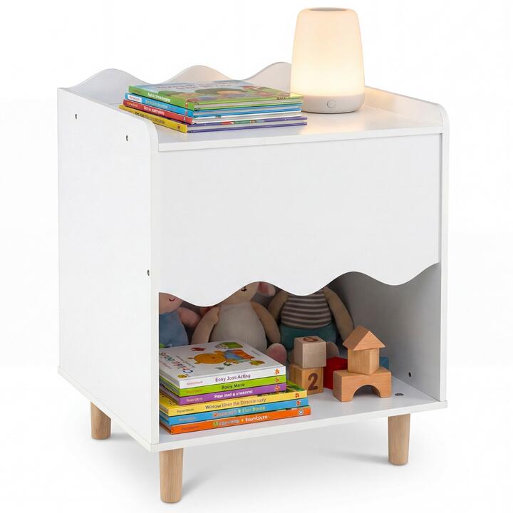 Kids can use it as a nightstand in their bedroom or a side table in the reading nook. It is 49.5 x 40 x 62.5 cm (L x W x H), ensuring convenient access. Scalloped design makes it look adorable. Solid rubber wood legs help it remain steady and stable. Furthermore, the spacious top and open compartment allow for ample storage space. Plus, smooth rounded edges and harmless finishes make it safe for kids to use. Anti-falling baffles prevent items from falling down. Bullet Points: Selected Rubber Wood Legs: The kids nightstand features 4 solid rubber wood legs that ensure remarkable sturdiness and long-lasting support, making it perfect for active little ones. The natural rubber wood legs are also splinter-free. Wide Top & Open Compartment: The wide top is a nice choice for to display kids' items, such as toys, clocks, table lamps, or photo frames. Moreover, the open compartment allows kids to easily take out or place their items. Lovely Look & Child-friendly Size: Cute scalloped decoration makes it ideal for kid's bedroom or playroom. Kids can also decorate with stickers (not included) for DIY fun. Measuring 49.5 x 40 x 62.5 cm (L x W x H), the kid-sized nightstand is suitable for 3-6 years old kids. Versatile Nightstand for Children: Whether used as a nightstand or a side table for kids in the playroom or living room, it seamlessly blends style and practicality to enhance your child's space. Designed with Well-made Details: Anti-falling baffles protect items placed on the top. Smooth rounded corners ensure safe use. Additionally, the smooth surface can be easily wiped clean with a cloth. Specifications: Colour: Pink/ White Material: Rubber Wood, MDF Product Size: 49.5 x 40 x 62.5 cm (L x W x H) Size of Top: 47.5 x 39 cm(L x W) Height of Rubber Wood Legs: 10 cm Suitable Age: 3-6 Years Old Weight Capacity of Top: 40 kg Weight Capacity of Open Compartment: 20 kg Net Weight: 9 kg Is Assembly Required: Yes Box Qty: 1 Package Includes: 1 x Kids Nightstand 1 x User Manual