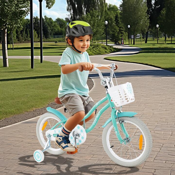This cute 30/36/40/46 cm children's bike will let your little one enjoy riding. Designed with adjustable handlebar and seat height, it's suitable for 4-8 years old kids or toddlers with 80-105cm/95-110cm/105-120cm/130-150cm height. Note: Measure kid's INSEAM and compare with SADDLE HEIGHT to check if the rider can touch the ground. Meanwhile, 2 anti-slip and shock-absorbing wheels can move safely and smoothly on flat surfaces. Kids won't feel uncomfortable when sitting on the smooth seat even after long-term riding. Besides, if kids want to stop the bicycle, there is a hand brake and a coaster brake for them to choose. Plus, it has passed AS/NZS 1927 and CPN No.6 of 2004. Bullet Point: Beautiful Outlook with Basket: Featuring attractive and stylish outlook, this kid's bike is sure to be a perfect gift for beginners to learn to ride. Apart from that, it also comes with a cute basket to fulfill kids' storage requirements, adding more fun to their riding. Adjustable Bike for Growing Kids: The 30/36/40/46 cm kid's bike is specially designed for your fast-growing children from 3 to 7/8 years. It has height-adjustable handlebar(67-74.5cm/ 71-77cm/78-85cm/80.5-88cm) and seat (45-55cm/50-60cm/55-65cm/60-70cm), which allows kids with different heights to ride with comfortable riding posture. Safe Handbrake and Coaster Brake: This children training bicycle is equipped with dual brake system: hand brake (shorter distance for kids' small hands) and coaster brake (pedal backwards to instantly stop). Besides, with fully enclosed chain guard for safety, the toddler bike improves kids' riding security to a higher level. 95% Pre-assembled and Optional Size: Different from other 85% pre-assembled bikes, ours with 95% pre-assembled design ensures quick and hassle-free installation. You can easily finish installation with your little ones. Plus, we provides multiple size options. Specially Designed for Young Riders: The wear-resistant pneumatic tires are made of multi-layer materials: rubber outer, buffer layer, cord ply, inner tube and protective layer, offering a safe and steady riding experience. The sturdy carbon steel frame and stable training wheels make it easy to ride. What's more, the PP covered seat improves the overall comfort. Features: Front storage basket for kids to place dolls, snacks and flowers Height-adjustable handlebar and seat accompany kids to grow up Dual brake system( hand brake and coaster brake) for convenient stop 95% pre-assembled design guarantees labor-saving installation Durable pneumatic tires for smooth riding Extra training wheels make it beginner-friendly Fully enclosed chain guard protects kid's safety AS/NZS 1927 and CPN No.6 of 2004 for more safety Premium carbon steel frame for outstanding durability Soft padded seat for kids to ride with utmost comfort Specifications: 12” Kid's Bike: Color: Pink/ Purple Material: Carbon Steel, PP, PVC, PP, TPR Overall Dimension: 86 cm x 49.5 cm x 67-74.5cm (L x W x H) Seat Height: 45-55 cm Inseam Size: 45-55 cm Suitable Height: 80-105 cm Suitable Age: 3-4 Years Old Weight Capacity of Seat: 45 kg Net Weight: 8.5 kg Gross Weight: 10.5 kg 14” Kid's Bike: Color: Pink/ Turquoise/ Yellow Material: Carbon Steel, PP, PVC, PP, TPR Overall Dimension: 104 cm x 51 cm x 71-77cm (L x W x H) Seat Height: 50-60 cm Inseam Size: 50-60 cm Suitable Height: 95-110 cm Suitable Age: 3-5 Years Old Weight Capacity of Seat: 45 kg Net Weight: 9 kg Gross Weight: 11.5 kg 16" Kid's Bike: Color: Pink/ Turquoise/ Yellow/ Red/Light Green Material: Carbon Steel, PP, PVC, PP, TPR Overall Dimension: 114 cm x 56 cm x 78-85cm (L x W x H) Seat Height: 55-65 cm Inseam Size: 55-65 cm Suitable Height: 105-130 cm Suitable Age: 4-7 Years Old Weight Capacity of Seat: 45 kg Net Weight: 10 kg Gross Weight: 12.5 kg 18" Kid's Bike: Color: Pink/ Turquoise Material: Carbon Steel, PP, PVC, PP, TPR Overall Dimension: 127 cm x 56 cm x 80.5-88cm (L x W x H) Seat Height: 60-70 cm Inseam Size: 60-70 cm Suitable Height: 120-150 cm Suitable Age: 4-8 Years Old Weight Capacity of Seat: 45 kg Net Weight: 11.5 kg Gross Weight: 14 kg Package includes: 1 x Kid's Bike 1 x Instruction Box Qty: 1(May vary by batch)