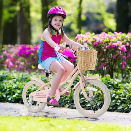 This bike features adjustable handlebars (69-73 cm/ 73-77 cm) and seat height (48 to 60 cm/ 56 to 68 cm). The customized height will be suitable for 3-5/4-7 years old kids or toddlers. 2 anti-slip wheels can move safely and smoothly on flat surfaces. What’s more, there is a hand brake (shorter distance for kids’ small hands) and a coaster brake (pedal backwards to instantly stop), allowing your little rider to stop the bike safely. Our padded saddle provides kids with a comfortable riding experience. More importantly, different from others with 85% pre-assembled design, our bicycle is designed with 95% pre-assembled design for effortless installation. Note: Measure kid’s INSEAM and compare with SADDLE HEIGHT to check if the rider can touch the ground. Bullet Point: Retro and Eye-Catching Appearance: With bright colors, fun bell and unique patterns, the kid’s bike is sure to appeal to your sweetie, encouraging them to go for a bike ride. Besides, there is a front basket for kids to store their “treasures”, such as flowers, leaves, dolls or snacks. If needed, you are allowed to remove the basket. Dual Brake System for Safe Riding: To better protect kid’s riding safety, we specially equip the child bike with dual brake system, including the hand brake and coaster brake. Plus, designed with fully enclosed chain guard, it helps to prevent accidental clamping. Designed for Fast-Growing Kids: The 14”/16” kid’s bicycle features adjustable saddle & handlebars (within 4cm), which is ideal for your fast growing child. You can adjust the seat from 48 to 60 cm/ 56 to 68 cm to suit little riders of different heights (95-110 cm/ 105cm-130 cm). And we offer multiple sizes for you to choose. 95% Pre-assembled Kids Bicycle: 95% of our bicycle is already assembled, which is better than other 85% pre-assembled bike. Thus, you are allowed to assemble the whole bicycle quickly and effortlessly. Then, your little one can enjoy riding immediately. Wear-resistant and Anti-slip Wheels: 2 rubber made wheels allow kids to ride smoothly on different kinds of flat roads, such as the wood floor, cement road, asphalt road and brick road. In addition, it includes 2 removable training wheels to help your young rider to keep balance. Specifications: Colour: Pink Material: Carbon Steel, Rubber, Sponge, PVC, PP Overall Dimension: 104 cm x 51 cm x 69-73 cm/114 cm x 56 cm x 73-77 cm(L x W x H) Saddle Height: 48-60 cm/56-68 cm Saddle Size:22 cm x 15 cm/ 23.5 cm x 16 cm(L x W) Inseam Size: 48-55 cm/55-62 cm Suitable Rider’s Height: 95-110 cm/105-130 cm Suitable Age: 3-5Years Old/4-7 Years Old Weight Capacity of Seat: 35-40 kg/ 45-50 kg Net Weight: 9.5 kg/10.5 kg Package includes: 1 x Kid’s Bike 1 x Instruction Box Qty:1(May vary by batch)