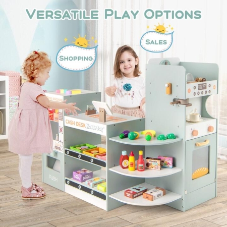 The wooden supermarket playset features a vending machine for kids to simulate real shopping experiences, while the cashier area provides a lifelike supermarket experience for little cashiers. Children can also brew coffee with the coffee machine and bake in the oven, adding to the playset’s interactive elements. The clock with moving hands and rotary knobs with clicking sounds offer even more enjoyment for kids. Additionally, the display shelves can hold play food accessories and personal items. This pretend play grocery store is an ideal gift for children above 3 years old, promoting their imagination, arithmetic skills, logical thinking, social interaction, and other important developmental abilities. Interactive Vending Machine: The kids grocery store playset boasts a unique 24-hour service vending machine that mimics real-world shopping. Just place the items, press the button, and get the item, enhancing both imaginative play and motor skills in children aged 3+ years old. Realistic Cashier Experience: Designed to simulate a genuine supermarket experience, the wooden supermarket includes a checkout counter featuring a scanning area, screen, and credit card payment option. This provides an ideal learning opportunity for little cashiers to develop early math and financial awareness. Creative Cooking Station: Kids can enjoy a simulated coffee maker where they can choose a flavor, grind coffee beans, filter, and enjoy a cup of coffee. Additionally, they can pretend to bake in the oven, offering a hands-on way to explore cause and effect while engaging in hours of imaginative play. Developmental Benefits: This wooden play market not only entertains but educates, featuring a clock with moving hands and rotary knobs that make clicking sounds. These interactive features are designed to capture children’s attention and help them learn to tell time, promoting both cognitive and fine motor development. Neatly Store Accessories: Coming with 30 pieces of play food and accessories, the wooden grocery store creates a more immersive play environment for little ones. The display shelves bring ample space for organizing accessories and other items, encouraging essential organizational skills and tidiness. Specifications:Colour: Green + WhiteMaterial: MDFOverall Dimensions: 95 x 61 x 83 cm (L x W x H)Size of Vending Machine: 30 x 25.5 x 60 cm (L x W x H)Size of Checkout Counter: 40 x 30 x 47.5 cm (L x W x H)Size of Coffee Machine: 31.5 x 30 cm (L x W)Net Weight: 17.5 kgSuitable Ages: 3+ Years Old Package Includes:1 x Grocery Store6 x Tableware3 x Coffee Beans1 x Filter1 x VIP Card3 x Boxes18 x Play Food1 x Instruction Box Qty:1(May vary by batch)