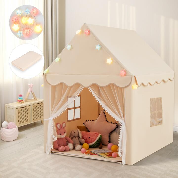 A Perfect Castle Tent for Kids to Read, Play, and Nap! Our playhouse tent creates a large private space for kids to entertain, read, play games, and enjoy themselves, which can greatly help cultivate your little one's imagination and enhance creativity. And the play tent is woven with polyester-cotton blended materials that are soft, anti-static, and skin-friendly. Furthermore, high-quality PVC tubes compose a firm and sturdy frame, so kids can play freely without worrying about falling apart. In addition, 2 mesh windows are embedded on both sides of the tent, ensuring better ventilation. And the large net curtain on the door can effectively keep mosquitoes out. Especially, our playhouse tent is designed with several beautiful star lights helping create a cozy atmosphere. The multipurpose outdoor and indoor play tent can be used in the living room, nursery, daycare, park, backyard, and more. Whether your kids want to read books, take a nap, enjoy picnics, or parties, it would be the perfect choice for them! Bullet Point: Spacious Playing Area: The kids playhouse measures 105 × 121 × 136 cm (L x W x H), providing large spaces that can accommodate 4 kids at the same time. Kids can not only daydream, take a nap, read books, or play with friends but also enjoy happy time with parents. Besides, the play tent can be used for outdoor parties or picnics. Durable Material and Solid Structure: The playhouse tent is made of thickened and skin-friendly polyester-cotton blended materials, providing a breathable, moisture-proof, and comfortable environment for kids, and it is also easy to clean. Besides, the tent is supported by high-quality and crack-resistant PVC tubes, ensuring excellent stability and safety. Shining Star Lights and Ventilate Design: Comes with a shining star-shaped light string that features 10 stars with different colors and measures 2 m, the play tent would create a cozy atmosphere for the kid's room. In addition, there exists a soft cotton mat and 2 mesh windows for comfortable seating and good ventilation. Perfect Gift for Kids: The vivid kids playhouse is designed with beautiful colors, giving kids a lovely fairy tale world of their own. And the breathable gauze curtain help kids enjoy private places for entertaining and exploring. Moreover, the multifunctional kids tent can be used for birthdays, carnivals, sleepovers, and more. It would be a wonderful gift for your kid. Easy and Fast Assembly: Equipped with step-by-step instructions and straightforward illustrations, the kids tent castle is easy and quick to assemble, and no tools are required. Besides, there exist zippers on the bottom for easy assembly and disassembly. It is also lightweight and portable which can be easily moved to the living room, backyard, or pack lawn. Features: Can be the perfect gift for your little boys and girls The breathable gauze curtain help keep mosquitoes out Provide large spaces to accommodate 4 kids at the same time With detailed instructions, it is easy to assemble and disassemble The curtain strap can tie curtains allowing kids to go in and out freely Kids can read books, take a nap, play games with friends or parents in it The soft and colorful starlights help create a cozy and bright atmosphere Supported by thick PVC tubes, crack-resistant, durable, stable, lightweight The mesh windows on both sides allow parents to observe inside conditions Made of polyester-cotton blended materials, skin-friendly, soft, wear-resistant Designed with a comfortable mat to seat, and equipped with straps for fixation Specifications: Colour: Blue/Pink/Green/Beige Material: Polyester-Cotton Fabric, PVC Overall Dimensions: 105 x 121 x 136 cm (L x W x H) Mesh Window Size: 31 x 30 cm(L x W) Star String Light Length: 200 cm Net Weight: 4 kg Battery: 2 x AA Batteries ( Not Included) Package Included: 1 x Kids Playhouse Tent 1 x Cotton Mat 1 x Star Light String 1 x User's Manual Box Qty:1(May vary by batch)
