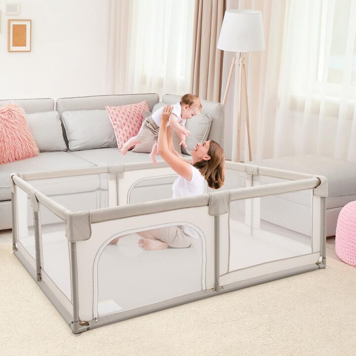 Our playpen can free up the hands of parents and provide your child with a space for independent exploration. The playpen is made of non-toxic and tasteless materials, which will not harm your baby's health. Door with zipper can effectively prevent the baby from escaping from the fence. On the other hand, the door on the fence is also convenient for babies to get in and out. Our fence can provide children with a safe and large enough play space, which reduces the burden on parents to a certain extent. In addition, the simple assembly steps make it easy to use, and the compact size makes it easy to place in any corner of the house or in the car. Bullet Point: 【Enjoy Endless Joy】 Our playpen can free up the hands of parents and provide your child with a space for independent exploration. Babies can practice climbing or walking in a spacious space, and even exercise multiple skills. And you can also enter the enclosure to enjoy endless joy with your baby. 【Breathable Mesh & Durable Zipper】 The four sides of the baby playpen are designed with soft and breathable mesh, which can provide good visibility and facilitate parents to follow the baby's dynamics in real time. In addition, the unique door with zipper opening design is convenient for babies to enter and exit. 【Non-toxic Material & High Stability】 Considering the baby's delicate skin and safety, we have carefully selected materials that are odorless and non-toxic. In addition, there are 4 non-slip rubber suction cups at the bottom of the fence, which can firmly fix all panels to the original place. 【Large Coverage for Baby to Play】 In order to effectively use the critical growth period of babies, we specially made this large and safe baby playpen for your little one to play. Kids can learn to crawl, walk or develop overall motor skills in a safe and spacious activity space. 【Simple Installation Process】 In order to improve installation efficiency, we have simplified the entire fence installation process as much as possible. Lightweight design makes it easy for you to move or carry our playpen to any desired place. And compact volume does not take up extra storage space. Features: 70 cm height panel can better prevent the baby from getting out of the fence Non-toxic and durable material ensures your baby's safety Anti-slip suction cups at the bottom to firmly fix all the panels Soft and breathable mesh can provide good visibility Doors with zippers can prevent the baby from running out of the fence Combine the panels into the desired shape according to your needs Provide enough spacious space for your baby to play, crawl, walk Easy to assemble, disassemble and move ASTM and CPSIA certification ensure high quality Specifications: Color: Blue/Gray Material: 210D Oxford cloth, iron, PE Product dimension: 190 x 150 x 70 cm (L x W x H) Door size: 74 x 51 cm Grid size: 72.5 x 48 cm Product weight: 9 kg Package Includes: 1 x Baby Playpen 4 x Rubber Sucker 16 x PE Connector 1 x Instruction Box Qty:1(May vary by batch)