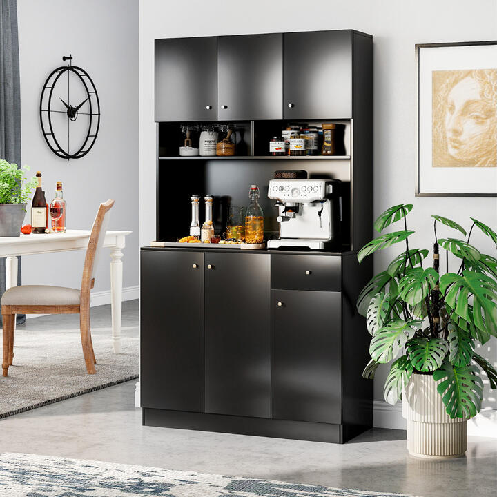 It combines enclosed storage areas and practical open compartments, featuring 3-level adjustable shelves, open compartments, a wide countertop, and a drawer. Equipped with AC outlets, 1 USB port and 1 type-C port, this tall cabinet provides an easily accessible charging station and convenient power access for kitchen gadgets and charging devices. Safety is a priority with anti-tipping kits and a sturdy base. The kitchen cabinet can support up to 350kg. Its modern appearance effortlessly complements any decorations, making it suitable for dining rooms, living rooms, and kitchens. Many other user-friendly details are waiting for exploration. Bullet Point: Enclosed Storage Areas: Elevate your kitchen’s functionality with the pantry cabinet, featuring a drawer and 3 3-position adjustable shelves with each level offering a 3.5cm adjustment. Besides, it has multiple doors with adjustable hinges for easy access. Ideal Power Accessibility: No more shortage of sockets. The tall kitchen cabinet is equipped with 2 AC outlets of 240V 15A, 1 USB port and 1 type-C port of 5V 2.1A, making it a breeze to operate kitchen gadgets and charge devices. Practical Open Storage: The buffet cupboard comes with 2 open compartments and a wide countertop, successfully reducing the hassle of finding kitchen supplies. Therefore, your glass, bowl, and seasoning will be easily accessible. Anti-Tipping Protection: Your family’s well-being is our top priority. That’s why the sideboard cabinet includes anti-tipping kits and a large base, ensuring a secure space in your kitchen. By the way, the overall load capacity reaches up to 350kg. Modern Design and Wide Use: The pantry cabinet is where sophistication meets modern utility. Its stylish appearance fits seamlessly into any decorations and is perfect for your dining room, living room, kitchen, and more. Specifications: Color: Black Material: MDF, Engineered Wood Overall Dimensions: 100 x 40 x 181 cm (L x W x H) Size of Upper Enclosed Shelves (Left): 64 x 21.5 cm (L x W) Size of Upper Enclosed Shelves (Right): 31 x 21.5 cm (L x W) Spacing Between Cabinet Top and Upper Shelves: 18 cm Each Level’s Adjustment of Adjustable Shelves: 3.5 cm Size of Each Open Compartment: 47.5 x 22 x 16 cm (L x W x H) Height of On-Countertop Clearance: 41 cm Size of Countertop: 100 x 36 cm (L x W) Size of Lower Enclosed Shelves (Left): 64 x 35 cm (L x W) Spacing of Lower Adjacent Shelves (Left): 35 cm Size of Lower Enclosed Shelves (Right): 31 x 35 cm (L x W) Spacing of Lower Adjacent Shelves (Right): 26 cm Inner Size of Drawer: 25 x 30 x 8.5 cm (L x W x H) Height of Base: 8 cm Length of Power Cord: 153 cm Total Load Capacity: 350 kg Load Capacity of Countertop: 150 kg Load Capacity of Drawer: 10 kg Net Weight: 60 kg Box Qty: 1(May vary by batch) Package Includes: 1 x Pantry Cabinet 1 x User Guide