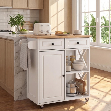 This kitchen island features a spacious rubber wood countertop, combining elegance with easy maintenance. Its versatile drop leaf design offers extra workspace when needed and folds down to save space. Equipped with 2 drawers, a storage cabinet with an adjustable shelf, 2 open shelves, and a towel rack, it provides ample room to organize cookware, utensils, and pantry items for a clutter-free kitchen. Mounted on four universal wheels, this rolling cart ensures smooth mobility and stable positioning. Ample Storage Space: This kitchen island offers a spacious countertop, towel rack, 2 drawers, a storage cabinet with a 3-position adjustable shelf, and 2 open shelves. So, you can easily organize cookware, utensils, small appliances, or pantry staples to keep your space neat and efficient.Versatile Drop Leaf Design: The drop leaf countertop lets you instantly expand it for more space when needed. Simply fold it down for space-saving storage when not in use. Besides, it is easy and safe to operate.Move with Ease: This kitchen table with storage is enhanced by 4 universal wheels (2 with brakes), providing easy mobility and reliable stability. The sturdy frame is constructed with safe rounded edges, smooth drawer slides, and premium metal hinges to ensure lasting durability and user-friendly safety.Rubber Wood Countertop: The solid wood top features a smooth, easy-to-clean surface with natural wood grain, bringing elegance and functionality to your kitchen. The beautiful finish resists stains and spills, making daily meal prep and clean-up quick and effortless.Timeless Elegance for Various Spaces: This rolling cart adapts to various home decoration styles, making it an ideal addition to modern, farmhouse, or classic interiors. Its blend of natural materials and practical features complements any kitchen, dining area, or open-plan living space. Specification: Color: Natural + WhiteMaterial: Rubber Wood + MDFOverall Dimension: 80 cm x 42.5 cm x 89 cm (L x W x H)Width of Drop Leaf Countertop: 25 cmWeight Capacity of Top: 30 kgWeight Capacity of Drawer: 5 kgWeight Capacity of Each Shelf: 10 kgNet Weight: 30 kgBox QTY: 1(May vary by batch)Is Assembly Required: Yes PackageIncludes: 1 x Kitchen Island1 x User Guide