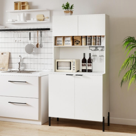 No worried about low battery or tangled cords! The recessed power strip is easy to charge multiple devices, along with a practical cable hole to manage wires. To keep up with your storage needs, the wine cabinet features open shelf and countertop to organize essentials. Inside, the adjustable shelf can be positioned in 3 positions for customized storage space. Designed for the wine enthusiast, this built-in wine glass rack is perfect for displaying your favorite glasses. The unit stands on sturdy metal legs for stability and is fitted with anti-toppling kits for added safety. All in all, it is a substantial yet tasteful addition to your kitchen, dining room or living room. Bullet Point: Convenient Charging Station: Say goodbye to tangled cords and cluttered surfaces as you power up your electronics. This wine bar cabinet features a built-in charging station that includes 2 outlets, 1 USB port, and 1 type-C port, complete with a cable hole to keep wires organized. Perfect Storage Solution: The pantry cabinet provides ample storage space for kitchenware and dinnerware with its dual cabinets. The wide countertop and open shelf serve as a perfect staging area for appliances, dishes, spice jars and cans.Flexible Storage Options: The wine glass rack allows you to store and display your stemware in a convenient and organized manner. Additionally, the 3-position adjustable shelf in the bottom cabinet is easy to accommodate items of different sizes.Stable and Secure Build: Fitted with anti-toppling kits, this buffet sideboard can be securely anchored to the wall to avoid wobbling. Supported by robust metal legs with non-slip foot pads, this tall cupboard is a reliable addition to your home. Chic Style and Versatile Usage: This versatile piece can be used as a wine cabinet, buffet cabinet, cupboard, or coffee bar station. Its clean lines and elegant look enhance the visual appeal of any kitchen, dining room, or living room. Specifications: Colour: Black/White Material: Engineered Wood, MDF, Metal Overall Dimensions: 80 x 40 x 164 cm (L x W x H) Inner Size of Top Cabinet: 77 x 22 x 26.5 cm (L x W x H) Inner Size of Bottom Cabinet: 77 x 37 x 62 cm (L x W x H) Height of Open Shelf: 15.5 cm Raised Height from Ground: 15 cm 2 Outlets: 220-240V/10 A 1 USB Port and 1 Type-C: 5V, 3A Power Cord Length: 145 cm Weight Capacity of Countertop: 40 kg Weight Capacity of Open Shelf: 15 kg Weight Capacity of Bottom Shelf in the Cabinet: 20 kg Package Includes: 1 x Pantry Cabinet 1 x Instruction