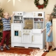 Unleash their imagination with the mini barista & chef combo kitchen! This all-featured play kitchen comes alive with realistic appliances, from coffee maker to microwave, sink to ice dispenser. Little hands will revel in the lifelike clicks of knobs and the thrill of brewing their first latte. Perfect for growing chefs, the 2-height counters fit kids aged 3-6 years, making this a fantastic shared station for friends or siblings. Post-play, clever storage options turn clean-up into fun learning chores! Crafted for safety and stability, it's the worry-free, all-in-one play kitchen that's ready to host the next big tea party. Gift it and watch as they dive into endless culinary adventures! Bullet Point:Mini Barista & Chef Combo: This wooden play kitchen lets junior chefs fire up the range hood, simmer on a 2-burner stove, bake in the oven, zap snacks in the microwave, wash veggies at the faucet sink, brew pretend lattes at the coffee station with its simulated clock, and drop "ice" from the dispenser for ultra-immersive fun. Every knob clicks and turns, giving the toy kitchen play set an authentic feel that keeps kids engaged for hours of screen-free role-play. 2-Height Counters: The 60 cm coffee bar and 46.5 cm cooktop on this kid's interactive play kitchen grow with your child, so 3-year-olds can reach the lower burners while 6-year-olds master the upper café. Siblings or play-date friends of different heights can cook side-by-side without tiptoes or stooping, making the pretend play toy a social hit. Smart Storage Options: After the feast is over, the toy kitchen hides every accessory behind 4 cabinet doors while a dish rack, spice shelf, and 5 hooks keep pots, pans, and play food neatly displayed. Cleanup becomes part of the game, teaching toddlers organization skills and ensuring the pretend coffee station is always ready for the next rush of imaginary customers. Added Safety & Stability: Designed with solid-wood legs, rounded corners, and an included anti-tip kit, this play kitchen set stays rock-steady even when energetic chefs lean in to stir. Parents relax knowing the kid's interactive play kitchen complies EN71/CPSIA for safe, wobble-free culinary adventures. All-Included Package: The interactive kitchen toy comes with a 6-piece cookware set, coffee cup & saucer, ice cup plus 2 cubes, getting kids ready for the first pretend dinner party. Boys and girls can immediately launch into barista, chef, or dishwasher roles, making it the perfect one-and-done present. Specification:Color: Blue/BeigeMaterial: MDF, Pine WoodOverall Dimensions: 84 x 30 x 90 cm (L x W x H)Height of High Countertop: 60 cmHeight of Low Countertop: 46.5 cmSuitable Age: 3-6 Years OldNet Weight: 14 kgBox QTY: 1(May vary by batch)Is Assembly Required: Yes Package includes:1 x Kids Play Kitchen4 x Kitchen Utensils1 x Pot with Lid1 x Frying Pan1 x Coffee Cup1 x Ice Cup2 x Ice Cubes1 x User Guide