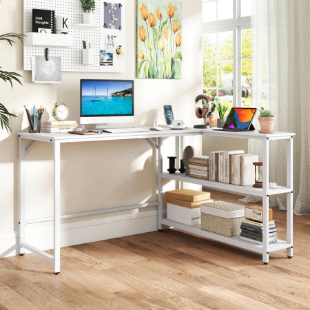 With a built-in charging station offering multiple outlets, you can effortlessly power your devices right where you work. Not only does it provide ample workspace for computer and other office essentials, but the open storage shelves keep a variety of supplies within reach. Crafted with a sturdy metal frame and triangular structure, this gaming desk offers stability and durability for long-term use. Whether you need a spot to work, study, or game, this modern computer desk is versatile addition to your home and office. Bullet Point: Built-in Charging Station: The L-shaped desk features a recessed power strip for convenient charging. It includes 2 outlets, 1 USB port, and 1 type-C port, keeping multiple devices powered up without the clutter of extra cables. Generous Workspace: With a spacious desktop, this home office desk offers ample space for monitors, tablets and other essentials. Its L-shaped design is tailored to fit corner spaces, making it an ideal choice for small areas while providing ample working area. Integrated Storage Shelves: This corner desk comes with multiple storage shelves to keep your workspace organized. You can utilize the shelves to store books, decorations, storage boxes, and office supplies for easy access. Reliable Construction: Crafted with heavy-duty metal frame with triangular structure, this gaming desk ensures great sturdiness and support. The bottom legs are fitted with adjustable foot pads for higher stability. Versatile Home Office Desk: The study desk is thoughtfully crafted to offer proper desktop height, ensuring a comfortable working environment. Whether used for working, studying, writing or gaming, the modern computer desk caters to various needs. Specification: Color: White Material: Engineered Wood, Metal Product Size: 131 x 106 x 75 cm (L x W x H) Dimensions of Large Tabletop: 131 x 50 cm (L x W) Dimensions of Small Tabletop: 106 x 25 cm (L x W) Height Between Shelves: 31 cm/29 cm 2 Outlets: 240V/15A 1 USB Port & 1 Type-C: 5V,2.1A Power Cord Length: 150 cm Net Weight: 19.5 kg Weight Capacity of Large Tabletop: 50 kg Weight Capacity of Each Shelf: 20 kg Is Assembly Required: Yes Box Qty: 1(May vary by batch) Package Includes: 1 x L-shaped Computer Desk 1 x Instruction