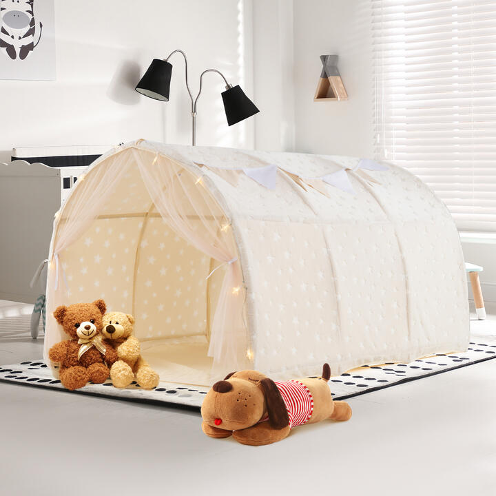 Looking for a gift to ignite your child's imagination? The 2-in-1 bed tent is a unique bed canopy that will make kids’ bedtime an exciting experience. The children bed shelter can meet dual purpose as a play area during the day and cozy sleep area at night. Designed to fit twin beds, this bed tent is designed to provide a secure and comfortable sleeping space for your child. More importantly, the star pattern on the kids bed tent will emit green lights in the night or dark surroundings, transporting kids to a magical wonderland. Also, the front and rear mesh curtains will promote ventilation and prevent unwanted guests. Equipped with a star light string and flag banner, the magical play tent exudes charm and sweetness, turning any room into a whimsical paradise. Crafted with skin-friendly flannel fabric and fiberglass poles, the twin bed tent for kids is built-to-last. Bullet Point: Sleep Under the Glowing Stars: The kids bed tent features glow in the dark stars to create an enchanting starry sky, which is visible from both inside and outside. The green lights allow children to imagine sleeping under the stars and enjoy a delightful dream experience. 2-in-1 Versatile Design: The bunk bed tent features a width of 101cm to seamlessly fit a twin-size bed. It provides a safe environment to prevent kids from falling off, ensuring them enjoy a sweet dream. Additionally, the kids tunnel tent acts as a gateway to a world of play, allowing your child's creativity to soar. Comfort and Privacy Combined: Featuring double net curtains, the play tent gives your child the option to enjoy both privacy and airflow as they drift off to sleep. Furthermore, the magical playhouse is made of flannel material, which is designed to provide warmth, comfort and breathability for a cozy sleep experience. Sparkling Charm with Decorations: The toddler playhouse is adorned with a starlight string and pennant banner, exuding charm and inviting endless playtime possibilities for your little one. With these decorations, the kids bedroom can be easily transformed into a charming environment. Knockout Gift for Kids: The indoor toddler bed canopy complies with EN71 and CPSIA standards, making it a perfect gift for boys and girls aged 3 years and above. The lightweight yet high-strength fiberglass poles ensure longevity. Plus, the assembly is a breeze without any tools. Specifications: Colour: Gray/Beige Material: 200 g Flannel, Fiberglass Pole, Mesh, Polyester Peach Skin Faille Product Dimensions: 137 x 101 x 82 cm (L x W x H) Net Weight: 1.5 kg Recommended Age: 3+ Years Old Box QTY: 1 Package Includes: 1 x Kids Play Tent 1 x Pennant 1 x Light Strip 1 x Instruction