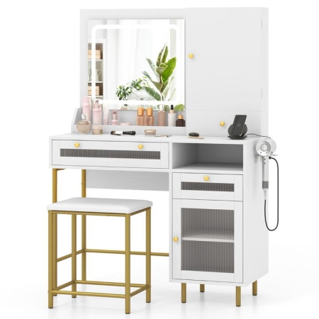 Enhance your daily routine with this dressing table. This makeup table features a built-in charging station for convenient device charging. The HD LED lighted mirror offers adjustable brightness and 3 color options to suit your needs. You can stay organized with ample storage including drawers, cabinets with adjustable shelves, and open shelves. This stylish and practical dressing table makes a perfect gift for loved ones on special occasions, combining functionality and elegance beautifully. Bullet Point: Built-in Charging Station: The charging station is equipped with 2 AC outlets and 2 USB ports. It allows you to charge your devices while you get ready, bringing you ultimate convenience within arm's reach. HD LED Lighted Mirror: The lighted mirror features 3-color LED lights with adjustable brightness (20%-100%) and easy adjustment through a touch button, offering warm yellow, warm white or cool white lighting according to your needs. Large Storage Capacity: The dressing table is equipped with a wide desktop, a top storage shelf, 2 small cabinets, 2 open shelves, a large drawer, 4 small drawers, and 2 large cabinets (each equipped with a 3-position adjustable shelf), offering ample space for organized storage and easy access. Sturdy and Safe Structure: Made of premium MDF and engineered wood, this makeup table can hold up to 50 kg. Plus, you can fixed the table to the wall using the included anti-toppling device. Stylish and Ideal Gift: Perfect for personal use or as a thoughtful gift for your wife, daughter, or friends on special occasions, this dressing table serves both practical and decorative purposes beautifully. Specifications: Color: WhiteMaterial: Engineered Wood + Mirror + MDFOverall Dimension: 105.5 cm x 40 cm x 150 cm (L x W x H)Mirror Dimension: 66.5 cm x 53.5 cmWeight Capacity of Tabletop: 50 kgAC Outlet: 220-240V/10AUSB Port: 5V/2.1APower Cord Length:1.5 mNet Weight: 46 kg Package includes:1 x Vanity Table1 x User Guide Box Qty:2(May vary by batch)