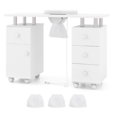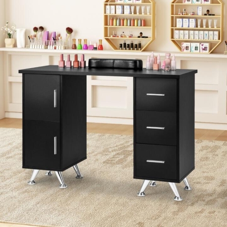This modern manicure table is designed to transform your nail routine with large storage space and a premium acetone-resistant tabletop. It comes with 2 large storage cabinet with safe buffered damp hinges and 3 drawers for classified storage, keeping your nail tools organized. Furthermore, this nail desk is crafted from thick MDF wood boards and reinforced by 8 heavy-duty metal legs, which are built to withstand daily use. Your clients will appreciate the comfort provided by the wrist rest cushion, covered in skin-friendly PVC leather, which can be easily moved for different needs. It caters to various settings, transitioning effortlessly between professional use in salons and personal use at home, making it an ideal choice for nail technicians, makeup enthusiasts, or those in need of a reliable workstation. Bullet Point:Sufficient Storage Space: Boasting 2 large cabinets and 3 deep drawers, this manicure table ensures all your nail tools and products are neatly organized and easily accessible, such as manicure tools, brushes, skin and hand creams, nail polishes, etc. Reliable and Stable Construction: The nail tech table is designed with a premium veneered MDF tabletop, which is not only acetone-resistant but also waterproof and easy to clean. Furthermore, it adopts 8 heavy-duty metal legs with elector-coating, ensuring a solid and secure foundation for all your nail care tasks. Comfortable Wrist Support: The nail station features a detachable wrist rest cushion with thick padding, enhancing your clients' comfort during nail treatments. Covered in premium PVC leather, it is easy to maintain while adding a touch of luxury and refinement to the table. Multipurpose Design: Whether used in a nail salon as a professional manicure table, in a bedroom as a chic makeup table, in the study room as a practical office table, or in the living room as a reliable computer desk, this multifunctional table could adapt to diverse needs. Easy Assembly: The wooden technician workstation measures 108 x 45 x 76 cm (L x W x H), the drawer interior measures 31 x 20.5 x 10 cm (L x W x H), and the cabinet interior measures 25.5 x 30 x 36 cm (L x W x H). With its simple structure and clear illustrations in the user's manual, it is easy to set up. Specifications:Colour: Black/Pink/WhiteMaterial: MDF, Metal, PVC Leather, SpongeProduct Dimensions: 108 x 45 x 76 cm (L x W x H)Drawer Interior Size: 31 x 20.5 x 10 cm (L x W x H)Cabinet Interior Size: 25.5 x 30 x 36 cm (L x W x H)Weight Capacity of the Tabletop: 40 kgWeight Capacity of Each Cabinet: 10 kgWeight Capacity of Each Drawer: 10 kgNet Weight: 34.5 kg Package Includes:1 x Manicure Table1 x Wrist Rest Cushion1 x User’s Manual Box Qty:1(May vary by batch)