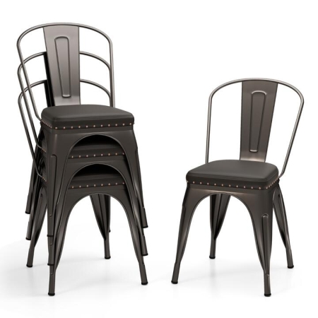 Serious about transforming your living space or cafe? Discover our chic metal dining chairs – where elegance meets functionality. Featuring luxurious cushioned seats wrapped in supple PU leather, each chair is a mini throne designed to offer maximum comfort with a dash of sophistication, thanks to the exquisite rivet trims. Need versatility? Remove the backrest and switch between a classic chair and a trendy backless stool in seconds! Perfect for compact spaces and bustling events, these lightweight, stackable chairs are unbelievably easy to manage. With a robust structure capable of holding up to 150kg and designed to prevent scratches and slips, these chairs are ready to elevate your dining setup, indoors or outdoors. Redefine your dining experience with style and comfort! Bullet Point: Comfortable Cushioned Seats: The metal dining chairs are equipped with 4 cm thick cushioned seats for an exceptional level of comfort. The seats are covered in skin-friendly PU leather, with exquisite rivets trimming the edge, adding to the aesthetic appeal and ensuring easy maintenance. Versatile Backrest Design: Designed for flexible use, the kitchen chairs come with a removable backrest. They can be used as traditional dining chairs with back support or as backless stools when a more casual seating arrangement is desired. Space-Saving Stackability: The dining room chairs are designed to be lightweight and stackable, which is a practical feature for saving space, especially in areas where storage is limited. It also streamlines the setup and breakdown process for events or daily use. Sturdy Construction: Built to last, the patio chairs feature cross-shaped structure and sturdy tapered legs that provide a solid foundation, holding up to 150kg of weight. The protective pads prevent leaving scratches when stacked, and the non-slip foot pads ensure the chairs remain stable on various flooring types. Versatile Use in Various Settings: These stackable chairs are not just limited to home kitchens; their design and sturdiness make them suitable for outdoor patio areas and cafes as well. They offer a chic and practical seating solution that can elevate the ambiance of any dining space. Specification: Colour: Black/Gun Grey Material: Metal, PU Leather, Sponge Overall Dimensions: 53 x 44 x 84 cm (L x W x H) Backrest Dimensions: 44 x 40 cm (W x H) Seat Dimensions: 36 x 37 cm (W x D) Seat Height: 47 cm Weight Capacity: 150 kg Net Weight: 18.5 kg Package Includes: 4 x Metal Dining Chairs 1 x User Manual Box Qty:1(May vary by batch)