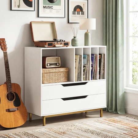 Crafted from thick wooden boards reinforced with a solid metal frame and equipped with anti-slip foot mats, this player table provides reliable stability for long-term use. Plus, blending retro charm with practical design, this mid century turntable stand features a spacious desktop, 2 large drawers, an open compartment and 4 vinyl storage racks to neatly organize your records, music scores and player. Versatile and stylish, the record storage cabinet serves not only as a record player table but also doubles as a nightstand or media console, while thoughtful details like elevated legs, user-friendly grooves and an easy-to-clean surface make daily use and maintenance effortless. Mid Century Turntable Stand: This record player stand brings a touch of retro charm to your versatile interior decorations, merging practicality with mid century design elements, serving as a highlight piece that exudes a classic vibe in your living space. Partitioned Rich Storage Space: Designed with a spacious desktop, 2 large drawers, an open compartment along with 4 vinyl storage racks, this retro vinyl holder offers sufficient space to store your vinyl records, music scores and record players neatly. Reliable Structural Stability: Constructed from high-quality and thick wooden boards, reinforced with solid metal structure, the record storage cabinet ensures dependable stability for long-term use. Plus, thoughtful anti-slip foot mats add extra steadiness. Multifunctional Player Stand: Combining aesthetics with storage, this versatile record player table efficiently serves as a player stand for your turntable while also being a useful addition as a nightstand in the bedroom or a media console in the living room. Meticulously Crafted Details: Paying attention to details, this retro record storage cabinet features user-friendly grooves, elevated table legs and an easy-to-clean surface, making reaching for stored items and daily cleaning a breeze. Specification: Color: White/Rustic BrownMaterial: MDF, Engineered Wood, MetalProduct Dimensions: 91 x 36 x 87 cm (L x W H)Inner Dimensions of Each Drawer: 83 x 29 x 8 cm (W x D x H)Ground Clearance: 11 cmNet Weight: 26 kgWeight Capacity of Desktop: 30 kgWeight Capacity of Open Compartment: 10 kgWeight Capacity of Each Vinyl Shelf: 5 kgWeight Capacity of Each Drawer: 10 kg Box QTY: 1(May vary by batch)Is Assembly Required: Yes Package Includes:1 x Record Player Stand1 x Instruction