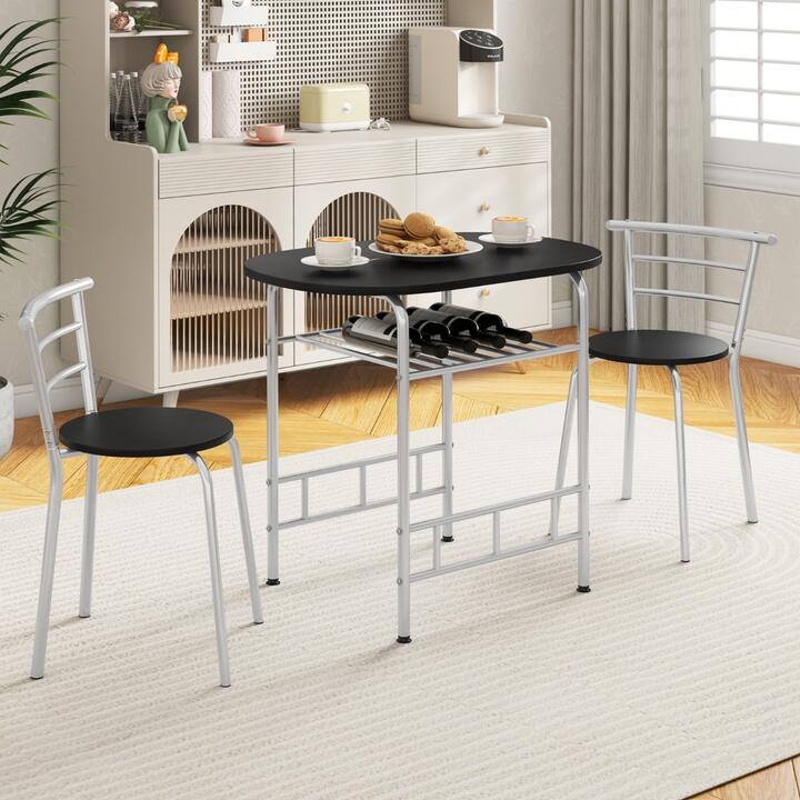 Create a cozy corner with this 3-piece dining table set! The kitchen set contains 1 practical table and 2 chairs for 2 people to enjoy intimate meals. The wide tabletop and additional wine rack provide abundant storage space for food, drinks, dishes, and more. Moreover, the ergonomic chairs have curved backrests and smooth seats to ensure ultimate comfort. When not in use, the 2 chairs can be tucked under the table. Made with MDF panels and metal pipes, this dining room set is durable and strong enough to offer a long-lasting service life. The tabletop supports up to 100 kg, while each dining chair holds up to 150 kg. Additionally, the dining set also features reinforced metal structure and adjustable foot pads to improve overall stability. Bullet Point: Equipped with A Wine Rack: Apart from a large oval tabletop, there is also a 6-bottle wine rack under the tabletop. With the built-in wine rack, you can freely arrange your wine bottles and keep them within reach. Ergonomic and Comfortable Chairs: Our kitchen set also includes 2 comfortable chairs. With an ergonomically curved backrest and the smooth and round seat, each chair can provide support for your back and hips for incredible sitting comfort. That way, you can enjoy your meals in comfort. Space-saving Design: When not in use, the 2 dining chairs can be stored under the table, allowing you to save space. Its compact size makes it suitable for smaller areas. The dining set can be used in kitchens, dining rooms, dorms, or narrow apartments. Excellent Durability and Stability: The high-quality MDF panels and solid metal pipes ensure superior strength and long-term use. The tabletop can bear a weight of 100 kg, while each chair can withstand a weight of 150 kg. The reinforced metal structure enhances its overall stability. The adjustable foot pads prevent the floor from being scratched. Easy Assembly and Dimensions: The simple structure and detailed user manual make assembly a breeze. All of the necessary accessories are included in the package. Once installed, the dining table is 80 x 53 x 77 cm (L x W x H), while each chair is 46 x 44 x 77 cm(L x W x H). Features: Comes with 1 functional dining table for storage and 2 dining chairs for sitting 1 wide oval tabletop and 1 built-in wine rack for easy access and storage Able to store drinks, hot dishes, tableware, glasses, and wine bottles Space-saving design makes it ideal for smaller apartments Ergonomic curved backrest goes well with natural body curves Premium MDF panels and metal pipes for long-term use Adjustable foot pads for added steadiness and floor protection Easy-to-clean surface allows for hassle-free maintenance Clear user manual helps you quickly finish installation Specifications: Color: Rustic Brown + Black/ Black/Black + Silver/Natural + White Materials: MDF + Metal Product Dimensions of Table: 80 x 53 x 77 cm (L x W x H) Product Dimensions of Each Chair: 46 x 44 x 77 cm(L x W x H) Weight Capacity of Wine Rack: 10 kg Weight Capacity of the Tabletop: 100 kg Weight Capacity of Each Chair: 150 kg Total Net Weight: 14.5 kg Package includes: 1 x Dining Table 2 x Dining Chairs 1 x User Manual Box Qty:1(May vary by batch)