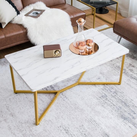 This coffee table, with a luxurious look, will take your living room decor to the next level in charm. Its tabletop has an elegant and attractive marble finish, which absolutely complements the high-end appeal of the table. And the tabletop is made of 25mm-thick MDF panel that is able to provide a long service life. The other eye-catching design is the metal frame that is coated with golden paint. The legs are built in unique Y shape, so as to ensure the overall stability. Besides, the bottom adjustable foot pads help to adapt to different surfaces, such as carpets or uneven floors. Thus, the table enjoys a superior stability and can support a load up to 75 kg. Bullet Point: Luxurious and Stylish Appearance: This modern coffee table, with a marble-like tabletop and golden legs, features a luxurious and stylish appearance and will definitely be the eye-catcher in your well-decorated home. Meanwhile, it is also an exquisite addition that brings appeal to the office or lounge. Thick and Qualified Tabletop: The tabletop of the coffee table is made of solid MDF board with a faux marble finish. The board that measures 25 mm in thickness enjoys extra durability and can withstand years of use. Besides, the corners are smoothly rounded off to avoid accidental bumps or scratches, making the table safer to use. Sturdy Y-shaped Legs: The stylish metal legs are designed in a unique double Y shape, increasing the overall stability while leaving enough room for storage. And the legs are coated with golden paint, and therefore, are rustproof and durable. In addition, the base is equipped with adjustable foot pads, so as to fit uneven floors. Suitable Dimensions and Wide Application: The dimensions of the square table are 107cm x 60cm x 45.5cm, very suitable for either small or big space. The tabletop can serve a tray of tea set and or a banquet of flowers, allowing you to enjoy the precious leisure time. You can also make it a low laptop table, on which your can either work or socialize. Easy Assembly and Maintenance: The sofa side table is simple in outline and easy to assemble. The package includes the necessary accessories and illustrated instructions, which will greatly save your time on installation. Meanwhile, you don’t have to spend much time on the table’s maintenance, since the smooth surface is waterproof. Feature: Composed of faux marble top and golden base for a luxurious look Thick tabletop is made of MDF for a long service life With smooth finish for easy maintenance Round corners avoid bumps or scratches Unique Y-shaped frame combines stability and practical storage Metal legs in sturdy structure hold up to 75 kg Fitted with adjustable foot pads to add extra stability Widely applicable in living room, office, lounge Easy to assemble with detailed and illustrated instruction Specification: Color: White + Golden Material: MDF + Metal Overall Dimensions: 107cm x 60cm x 45.5cm Net Weight: 13 kg Tabletop Thickness: 25mm Weight Capacity: 75 kg Package Includes: 1 x Coffee Table 1 x Instruction Box Qty:1(May vary by batch)