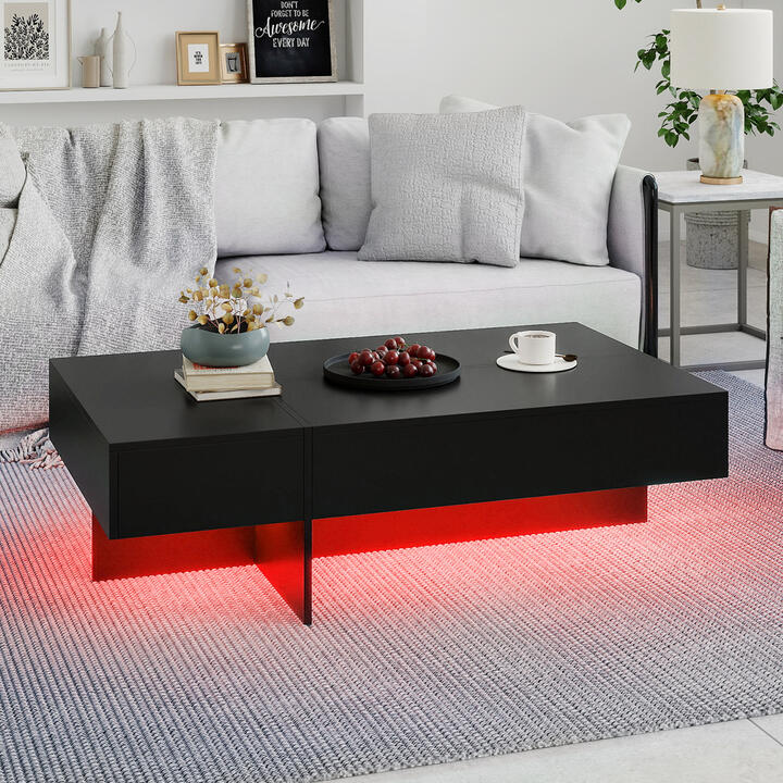 This ultra-modern coffee table not only dazzles with its high-gloss, scratch-resistant finish but brings your home to life with a multi-color LED light strip. With 20 colors, 21 modes, and customizable speed and brightness—all at the click of a remote—set the perfect ambiance for any occasion. Need practicality too? It's covered! Stash away clutter with 3 smooth-gliding drawers and enjoy a spacious tabletop that supports up to 45 kg. Whether it's tea time or time to work, this versatile table is the upgrade your living room deserves. Don't wait, transform your space today! Multi-color LED Light Strip: This high-gloss coffee table features a multi-color LED light strip with 20 vibrant colors, 21 unique modes, 8 adjustable brightness levels, and 8 speed settings, all controlled effortlessly via a remote (batteries not included). Enhances your living room with dynamic lighting options and customizable ambiance! High-gloss Surface: The rectangular coffee table boasts a high-gloss surface that is highly reflective, waterproof, and scratch-resistant, ensuring it maintains its pristine look with minimal maintenance. This feature makes it both visually striking and practical for everyday use. Ample Storage: The coffee table with storage includes 3 smooth-glide drawers that offer ample space for organizing living room sundries. The concealed drawers provide a clean and clutter-free appearance, making it an ideal living room center table. Built to Last: Constructed with a stable cross-shaped base and fitted with non-slip foot pads, this modern accent table is built to last. It can support up to 90 kg in total, ensuring durability and stability for all your living room needs. Multifunctional Use: Measuring 120 x 70 cm, the tabletop provides ample space for afternoon tea, laptops, and decorative items. This versatile living room center table serves as a perfect centerpiece, enhancing both functionality and style in your living space. Specification: Color: Black/White & BlackMaterial: Engineered Wood, MetalOverall Dimensions: 120 x 70 x 35 cm (L x W x H)Small Drawer Dimensions: 61.5 x 28 x 6.5 cm (W x D x H)Large Drawer Dimensions: 76.5 x 28 x 6.5 cm (W x D x H)Total Weight Capacity: 90 kgWeight Capacity of Tabletop: 45 kgNet Weight: 28 kgBox QTY: 1(May vary by batch)Is Assembly Required: Yes Package Includes: 1 x Coffee Table1 x Remote Control (Battery Not Included)1 x User Manual