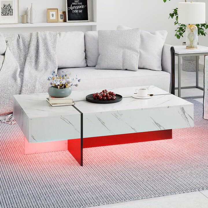 This ultra-modern coffee table not only dazzles with its high-gloss, scratch-resistant finish but brings your home to life with a multi-color LED light strip. With 20 colors, 21 modes, and customizable speed and brightness—all at the click of a remote—set the perfect ambiance for any occasion. Need practicality too? It's covered! Stash away clutter with 3 smooth-gliding drawers and enjoy a spacious tabletop that supports up to 45 kg. Whether it's tea time or time to work, this versatile table is the upgrade your living room deserves. Don't wait, transform your space today! Multi-color LED Light Strip: This high-gloss coffee table features a multi-color LED light strip with 20 vibrant colors, 21 unique modes, 8 adjustable brightness levels, and 8 speed settings, all controlled effortlessly via a remote (batteries not included). Enhances your living room with dynamic lighting options and customizable ambiance! High-gloss Surface: The rectangular coffee table boasts a high-gloss surface that is highly reflective, waterproof, and scratch-resistant, ensuring it maintains its pristine look with minimal maintenance. This feature makes it both visually striking and practical for everyday use. Ample Storage: The coffee table with storage includes 3 smooth-glide drawers that offer ample space for organizing living room sundries. The concealed drawers provide a clean and clutter-free appearance, making it an ideal living room center table. Built to Last: Constructed with a stable cross-shaped base and fitted with non-slip foot pads, this modern accent table is built to last. It can support up to 90 kg in total, ensuring durability and stability for all your living room needs. Multifunctional Use: Measuring 120 x 70 cm, the tabletop provides ample space for afternoon tea, laptops, and decorative items. This versatile living room center table serves as a perfect centerpiece, enhancing both functionality and style in your living space. Specification: Color: Black/White & BlackMaterial: Engineered Wood, MetalOverall Dimensions: 120 x 70 x 35 cm (L x W x H)Small Drawer Dimensions: 61.5 x 28 x 6.5 cm (W x D x H)Large Drawer Dimensions: 76.5 x 28 x 6.5 cm (W x D x H)Total Weight Capacity: 90 kgWeight Capacity of Tabletop: 45 kgNet Weight: 28 kgBox QTY: 1(May vary by batch)Is Assembly Required: Yes Package Includes: 1 x Coffee Table1 x Remote Control (Battery Not Included)1 x User Manual
