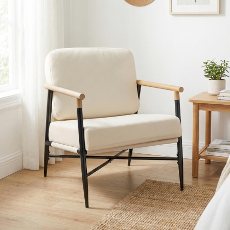 Crafted with a sturdy heavy-duty metal frame, this accent armchair offers reliable support and long-lasting durability. Thoughtfully designed with adjustable foot pads, the armchair adapts effortlessly to uneven flooring, enhancing stability and user experience. Moreover, the soft padded cushions with removable and zippered covers provide ultimate comfort and easy maintenance. With contemporary silhouette and neutral beige upholstery, the chair fits well with various places, including living rooms, bedrooms, or home offices. Whether you're curling up with a book or adding a cozy seating option to your workspace, our lounge chair will be your ideal choice. Bullet Point: Comfy Sitting Experience: Coming with 2 plush cushions, the accent chair allows you to enjoy ultimate relaxation for extended sitting. The back and seat cushions are padded with soft PP cotton and elastic sponge for optimal comfort. Robust Metal Construction: Built with a heavy-duty metal frame, the lounge chair ensures exceptional stability and durability. The indoor armchair supports up to 150 kg. Plus, X-shaped structure and adjustable foot pads enhance overall strength and steadiness. Added Ergonomic Comfort: The thick seat cushion provides optimal hip support to reduce your fatigue. Additionally, the supportive armrests enable you to rest your arms and hands. More Details of Accent Chair: The zippered cushion covers are detachable and machine-washable, making cleaning a breeze. The faux wood grain surface of arms adds more charm and texture to your living space. Wide Range of Application: The accent armchair blends seamlessly into various room styles. The stylish beige fabric and black frame make the chair a wonderful addition to different places, such as living rooms, bedrooms, offices, reading rooms, and more. Specification: Color: Beige Material: Metal, Polyester Fabric, PP Cotton, Sponge Product Dimensions of Frame: 73 x 67 x 66 cm (L x W x H) Size of Back Cushion: 66 x 66 cm(L x W) Size of Seat Cushion: 66 x 55 x 17 cm(L x W x H) Weight Capacity: 150 kg Net Weight: 11 kg Is Assembly Required: Yes Box Qty: 1 (May vary by batch)