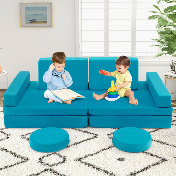 Featuring 2 trapezoidal pillows, 2 rounded cushions, 2 rectangular cushions, a thick folding mat and a thin folding mat, the sofa set offers endless possibilities to stimulate creativity, Imagination, motor skills and logical capability. Plus, these cushions can be easily moved with a practical black fabric handle. Moreover, our 8-piece sofa set offers various free combinations such as sofa, fort, tunnel, bridge, car, tent, slide, bed lounge or anything your kids can imagine. Additionally, features machine-washable fabric and smooth zippers, the soft suede cover can be removed easily for machine washing. Made from durable & child-friendly material, the sofa is not easy to deform. It is a perfect gift for your kids! BulletPoint: 8 Piece Modular Kids Sofa: Consisting of 2 trapezoidal pillows, 2 rounded cushions, 2 rectangular cushions, a thick folding mat and a thin folding mat, this 8-piece children's toy set can be easily reconfigured into a sofa, a tunnel, a fort, a car, a tent, a slide, a bed lounge or anything that your kids can imagine. Kid-Friendly & Safe Design: Made of soft suede fabric and high-density sponge, this comfortable sofa is safe and durable for children of all ages. The high elastic sponge is strong enough to withstand various adventures activities of children, providing them with a soft surface to crawl, jump and rest without fear of falling. Perfect Gift for Imaginative Kids: More than just for fun, this modular sofa set will inspire child's unlimited creativity, imagination, logical capability and other potentials while reduces screen time. What’s better, parents can spend quality time and building stronger relationships with their children by joining this fun activity. Easy Maintenance: Thanks to the smooth zipper, the soft suede fabric cover can be easily removed for machine washing. In addition, this skin-friendly fabric features high resistance to fading, shrinkage and shedding, with built-in handles for easy movement. Restore Step: If you receive this set that is not on its original shape, don't worry. First open the package and take out the vacuum cushion roll, then unroll it till it is flat, wait for 48 hours for foam to expand after opening, and the back to normal shape and thickness. Specification: Colour: Blue/ Green/Grey Material: Suede Fabric, Sponge Item weight: 12 kg Overall Dimension: 168 x 84 x 54 cm(L x W x H) Dimension of Rounded Cushion: 34 x 8 cm (D x H) Dimension of Trapezoidal Pillow:55 x 31 x 32 cm (L x W x H) Dimension of Thick Cushion: 168 x 84 x 14 cm (L x W x H) Dimension of Thin Cushion: 168 x 84 x 8 cm (L x W x H) Dimension of Rectangular Cushion: 80 x 12 x 12 cm(L x W x H) Box Qty: 1(May vary by batch) Is Assembly Required: Yes Package Includes: 2 X Trapezoidal Pillow 2 X Rounded Cushion 2 X Rectangular Cushion 1 X Thick Cushion 1 X Thin Cushion