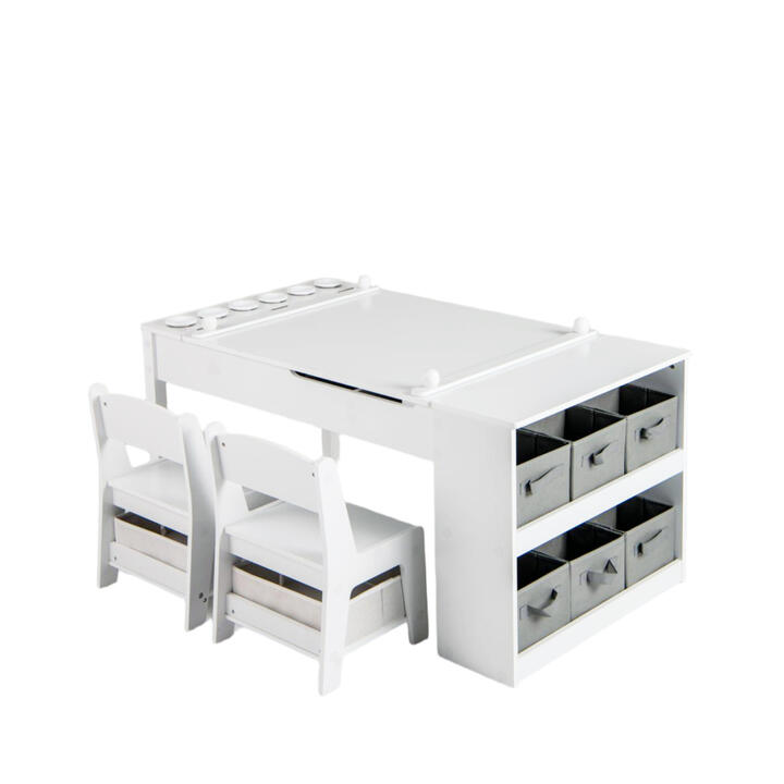 The 2-in-1 flip-top table transforms from a flat desk to an art easel in seconds, complete with paper roll holder, paint cups, and comfy chairs for up to 2 artists. Equipped with spacious storage cubes and a total of 8 folding fabric bins, it keep crayons, paints, and supplies organized and easy to find, while the chairs tuck neatly underneath to save space when playtime ends. The set also features anti-pinch handles, a slow lowering gas strut, plus rounded edges to protect busy little painters. It is a wonderful gift for kids above 3, fostering inspiration, organization, and happy memories in any play space! Bullet Point: Flip-top Easel Table: This versatile toddler art station includes a desk and 2 chairs, perfect for shared activities such as drawing, writing, crafting, and playing. In addition, the desk effortlessly converts into a kids' art easel by simply lifting the tabletop, inspiring creativity and fun. All-in-1 Creative Center: The kids table comes fully equipped for artistic expression, featuring a built-in paper roll holder, a paper fixing rod, and 6 paint cups for your child's creative projects. 1 roll of replaceable drawing paper (5 m x 44 cm) is included, offering extensive drawing space. Ample Storage Place: The painting table offers 2 under-table compartments, plus 2 shelves with 6 folding fabric bins to neatly organize kids’ art supplies. The space-saving chairs tuck neatly under the table when not in use, each equipped with 1 bonus bin under the seat for extra storage. Reliable Art Table Set: Designed with safety in mind, the easel table features anti-pinch cutout handles and robust gas struts to protect little fingers. Wide seats and backrests on chairs provide supportive seating, while the rounded corners ensure a safe environment for kids’ active moves. Perfect Addition to Kids’ Space: Ideal for children aged 3 and up, this desk and chair set is a thoughtful gift for birthdays, Christmas, and the start or the end of the school year. Its simple, cute design seamlessly fits into any playroom, kid’s room, nursery, or kindergarten setting. Specifications: Color: White + Natural/White + Grey Material: MDF Table Dimension: 109 x 60 x 55 cm (L x W x H) Chair Dimension: 32 x 30x 48 cm (L x W x H) Seat Height: 25 cm Seat Depth: 25 cm Seat Width: 29 cm Fabric Drawer Dimension (Table): 18x 15 x 15 cm (L x W x H) Fabric Drawer Dimension (Table): 29 x 25 x 10 cm (L x W x H) Size of Paper Roll: 5 m x 44 cm (L x W) Paint Cup Dimension: 7 x 7.5 cm (Dia x H) Weight Capacity of Tabletop: 91 kg Weight Capacity of Each Chair: 75 kg Suitable Age: 3+ Years Old Net Weight: 23 kg Box Qty: 1(May vary by batch) Package Includes: 1 x Kids’ Table 2 x Kids’ Chairs 1 x Paper Roll 6 x Paint Cups 8 x Fabric Bins 1 x User Guide
