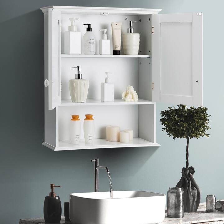 Organize your essentials in an easy way! Designed with small structure and big capacity, the cabinet will be a perfect partner to organize your items with less space occupying. With the internal adjustable shelf, it provides greater storage possibilities to accommodate the items at different heights. As it is made of superior environmental material, you will never worry about durability and have a healthy living environment. Combined with intimate double doors and knob design, it is easy to use and will keep your items from accidental falling. Do not hesitate to purchase it. Bullet points: Space Saving with Hanging Design: Designed to be wall-mounted, this bathroom cabinet skillfully takes use of the suspended area for which there will be less space occupying. Featuring double opening doors, this wall cabinet efficiently prevents items from accidental falling. Adjustable Interior Shelf: This versatile storage cabinet is equipped with an adjustable built-in shelf which has 3 height settings to fit different sizes of items. Besides, with an opening shelf on the bottom, this cabinet provides a convenient way to store the daily essentials for easy access. Multi-Purpose Wall Storage: This bathroom wall cabinet is the best storage solution for small spaces. It can serve to store towels, shampoo and other toiletries in the bathroom. Meanwhile, it is suitable for being mounted on the porch, living room, kitchen and other walls to meet your storage needs. Durable & Stable Construction: Made of eco-friendly P2 grade of MDF board, the storage cabinet is so durable and stable, which promises long service life. Whatever as storage furniture or home decoration, the wall cabinet covered with sleek finish brings your home a simple and fashionable style. Easy Assembly & Simple Cleaning: Comes with detailed instructions and numbered parts, the bathroom wall cabinet has straightforward illustrations. Each screw has its own code. It may take you some time and energy. Smooth and waterproof surface also make it clean easily. Features: Wall mount design for space saving Built-in shelf can freely adjust height to meet the needs of different items Strong load capacity to satisfy storage requirements Material of environmental grade ensures health Double door design to avoid falling and damaging items Smooth surface for convenient clean-up Elegant appearance to match the room of all styles Easy to open a door with knobs Specifications: Color: White Material: P2 MDF Net Weight: 9kg Overall Dimension: 60 x 20 x 70.5cm (L x W x H) Weight Capacity of Each Shelf: 8KG Package Includes: 1 x Bathroom Wall Cabinet 1 x Manual Box Qty:1(May vary by batch)