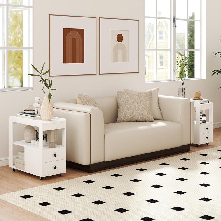 Revolutionize your space with our sleek, lockable end table on wheels! Maximize storage with this stylish 3-tier, 2-drawer table, designed to glide effortlessly into tight corners or alongside your sofa. Lock it in place for a sturdy, spill-free setup. This piece isn’t just functional – its strong build and easy-clean finish ensure enduring beauty, making it a smart addition to any busy home. With raised edges and round corners, it’s as safe as it is chic. Perfect for small spaces but spacious enough for all your essentials—upgrade your living room, bedroom, or office today with this must-have mobile solution! Bullet Point: Triple the Storage, Double the Drawers: Imagine having a 3-tier open storage space and 2 drawers all in one end table! This versatile piece keeps your essentials organized and within reach, making it the perfect addition to any room. Move with Ease, Lock with Confidence: Equipped with 4 universal casters, 2 of which are lockable, this rolling side table glides effortlessly across the floor. When you find the perfect spot, just lock the casters to keep everything stable and secure. Built Tough, Stays Looking Great: Crafted from thick boards with a sleek finish, this narrow bedside table is built to last. Easy maintenance means it will stay looking pristine for years to come, no matter how much you use it. Thoughtful Design for Everyday Living: The tabletop features raised edges to keep items from sliding off, and rounded corners to protect you from bumps. Plus, the sleek knobs and metal slides also give your a better experience. It’s the little details that make this mobile end table a standout piece! Compact, Yet Perfectly Sized: With an overall dimension of 65 x 30 x 63 cm (L x W x H), this 3-tier end table is ideal for small spaces. It fits snugly in tight spots in your living room, bedroom, or home office. Features: Versatile options to keep essential in reach and organized 3-tier storage space for books, snacks, table lamps and decorations 2 handy drawers with knobs provide essential space for private items Thick boards and sturdy construction for long-time use With 4 universal casters, smooth rolling for easy mobility Lockable features to stop at will Raised edges prevent spills from slipping off Rounded corners prevent accident bumps or scratches Smooth metal slides ensure easy operation of drawers Narrow side table fits small spaces Assembly needed Specification: Color: Natural/Black Material: Engineered Wood, MDF Overall Dimensions: 65 x 30 x 63 cm (L x W x H) Dimensions of Middle Shelf: 63.5 x 27 x 23 cm (L x W x H) Dimensions of Bottom Shelf: 31.5 x 27 x 25.5 cm (L x W x H) Inside Dimensions of Drawer: 22 x 28.5 x 9 cm (W x D x H) Weight Capacity of Tabletop: 40 kg Weight Capacity of Shelf: 10 kg Weight Capacity of Drawer: 5 kg Net Weight: 14 kg Package Includes: 1 x End Table with Drawers 1 x User Manual