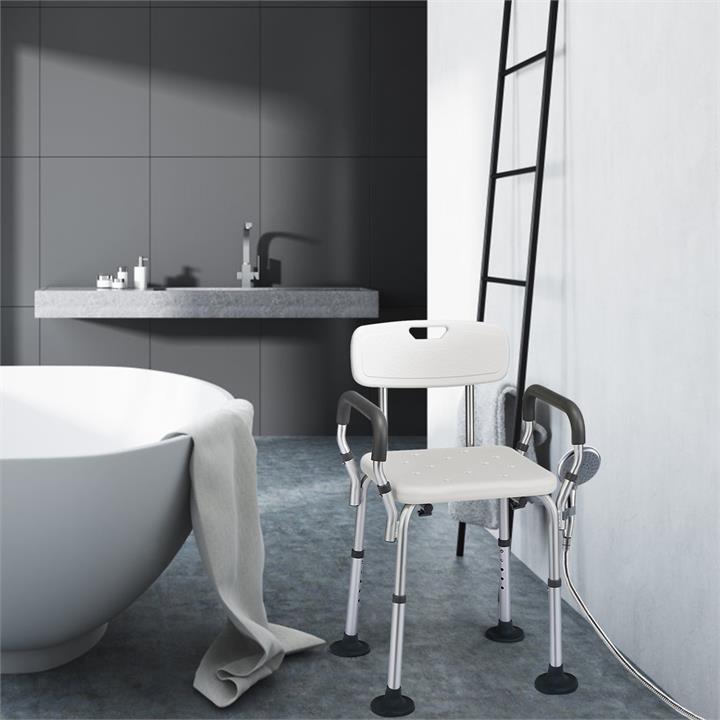 This shower chair will be your best choice to keep safe and comfortable in the shower. This bath chair with the backrest adopts ergonomic design, which offers support and comfort for you. You will enjoy cosy and soft sitting experience with PE pads on both seat and back. What’s more, this shower chair can be adjusted to 5 heights from 41cm to 51cm, which will not only meet your various needs, but also be perfect for seniors, the handicapped and injured. The aluminum frame is lightweight and ensures the stability and durability of this shower chair. Also, rubber pads works great in avoiding slipping and sliding, improving your safety in use. Enjoy your bath time with this shower chair! Bullet Point: 5 Adjustable Heights: You are allowed to adjust 5 different heights of this shower chair from 41cm to 51cm, which will satisfy your needs. On the other hand, this adjustable design is perfect for people who are unable to stand during shower, especially for the elderly, disabled and injured. Anti-slip Design Ensure the Safety: Featuring with 4 upgraded anti-slip rubber mats, this bath stool offers stability and security for you to avoid accident. There are several drainage holes on the bath seat designed for allowing water to drain and prevent slippery seat. Lightweight and Stable Frame: Our shower bench is constructed with aluminum frame, which ensuring the stability and durability, and the lightweight shower stool frame supports up to 150kg. The lightweight frame is easily portable for added convenience. Comfortable Sitting Experience: Enjoying with 40cm X 33cm seat and 41cm X 17cm backrest, this shower chair gives you soft and comfortable sitting experience while taking a shower. Moreover, the additional shower buckle makes convenience for you enjoying easy shower time. Easily Lifts with Armrest: Considering chair will become slippery and difficult to lift after bathing, the seat is designed with padded armrest for extra support and easy carrying. Detachable backrest and armrests satisfy with your various needs. And you could hold the armrest on the each side to keep balance when in bathing. Features: Heavy-duty and durable aluminum frame Upgraded feet pads and anti-skid seat for extra safety Ergonomic chair with back and seat offers great comfort and support 5 adjustable heights satisfy various needs of people such as the elderly and disabled Padded armrest for secure sitting and convenient moving or carrying Seat with holes allows consistent drainage and keep away from slipping or sliding Compact size and simple appearance make it suitable for most bathtubs and showers Easy to place shower head with shower buckle Suitable for the elderly, seniors, adults, disabled, pregnant women Specifications: Color: White Material: Aluminum alloy + PE Overall dimension: 53cm (L) x 48cm (W) x (72-82)cm(H) Load capacity: 150kg Net weight: 3.5 kg Sitting height: 41 -51cm Package includes: 1 x Bath chair 1 x Instruction manual Box Qty:1(May vary by batch) Is Assembly Required: Yes