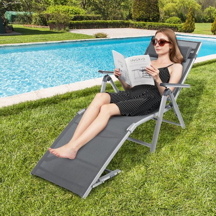 Time to relax after a tiring day by lying on this outdoor aluminium chaise lounge chair! Whether you want to read, sunbathe, or just take a nap, our outdoor recliner will be a great choice thanks to its 8 back and 2 leg adjustable positions. What's more, compared with other similar products which are heavy, unstable and easy to rust, this patio chaise lounge will never have these troubles, because it is made of a premium aluminium frame. As for the user experience, the breathable and quick-drying fabric covers the entire seat to bring you ultimate comfort. And the adjustable pillow can support your head or lumbar based on your preference. You can remove it as well. If you do not need this outdoor recliner, just fold it for easy movement and storage. Bullet Point: Adjustable Outdoor Recliner: To meet your different requirements from reading to sunbathing, even for taking a nap, this outdoor chaise lounge chair features an 8-level adjustable backrest. All you need to do is pull up the armrests simultaneously. Besides, the 2 leg positions provide better relaxation for you. Folding and Portable Design: The foldable design makes this patio chaise lounge convenient to store, greatly saving your home space no matter indoors or outdoors. Moreover, the lightweight aluminium frame allows you to carry this outdoor recliner to the patio, poolside or backyard effortlessly. Selected Aluminum Frame: Apart from the advantage of being lightweight, the high-quality aluminium frame is rustproof and stable as well as resistant to outdoor changing weather. Additionally, the sturdy triangular structures, reinforced connections and anti-slip foot pad endow strong stability. Quick-drying Fabric: To make your leisure time not have to wait after the rain, this patio folding chaise is made of quick-drying fabric that is also breathable, letting you have a cozier lying experience. And the pillow is adjustable and removable so that you can use it as a headrest or lumbar pillow as your wish. No Installation Required: This outdoor aluminium chaise lounge chair is not needed to assemble, which significantly saves your precious time and energy. The overall dimension of unfolding: 180/174/168/163.5/159/149.5/144/136 x 67 x 69.5/74/79/83/87/90.5/93/95 cm (L x W x H), overall dimension of folding: 74 x 67 x 18.5 cm (L x W x H). Please refer to the size instructions before purchasing to avoid unnecessary trouble. Features: 8-position adjustable backrest for reading, sunbathing or taking a nap Put down the footrest for complete relaxation and enjoyment Folding and lightweight design for hassle-free movement and storage Make this recliner stay with you for a longer time due to the anti-rust aluminium frame Sturdy triangular structures and non-slip foot pads for better steady performance Durable fabric with mesh design for breathability and fast-drying Support your head or lumbar by adjusting the removable pillow up and down Zero-assembly for time-saving Specifications: Colour: Black Material: Fabric, Aluminum Overall Dimension of Unfolding: 180/174/168/163.5/159/149.5/144/136 x 67 x 69.5/74/79/83/87/90.5/93/95 cm (L x W x H) Overall Dimension of Folding:74 x 67 x 18.5 cm (L x W x H) Seat Height from the Ground:30 cm Dimension of Pillow:40.5 x 16 x 6 cm (L x W x Thickness) Net Weight:7 kg Weight Capacity:110 kg Package Includes: 1 x Chaise Lounge 1 x Headrest 1 x Instruction Box Qty:1(May vary by batch)