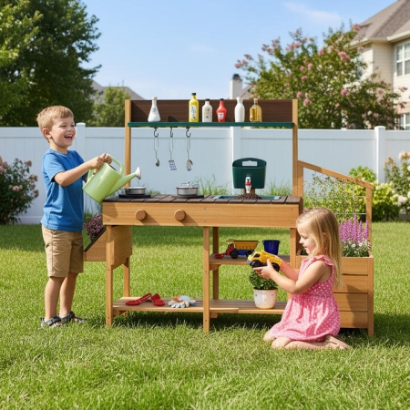 Get closer to nature with 2 planter boxes and a trellis, while enjoying pretend cooking on 2 stoves and 2 rotation knobs with cooking accessories. The sturdy wood construction ensures stability and safety, mimicking a real kitchen for imaginative meal prep. Organize kid's treasures with storage shelves and hanging hooks, making it a perfect gift for children aged 3-8 to enhance their playing experience and organizational skills. Bullet Point: Removable Faucet and Sink: Dive into hours of imaginative play with the kids mud kitchen's removable faucet and sink, designed specifically for sand, water, and mud play. This feature encourages sensory experiences and supports the development of motor skills, making it a playful addition to your child's outdoor activities. Gardening Adventures Await: Fostering an early love for green thumbs, the pretend kitchen includes a spacious planter box with a trellis and an additional smaller box, perfectly sized for little hands. Children can grow their own plants or flowers, experiencing the joy that comes from caring for something from seed to blossom. Chef's Paradise: Spark culinary creativity with 2 stoves, 2 clickable rotation knobs, and a suite of cooking accessories including a frying pan, pot with lid, skimmer, spatula, and spoon. This setup not only mimics a real-life kitchen but also offers a playful platform for kids to engage in imaginative meal preparation and role-playing. Wood Construction: The toy kitchen is crafted from fir wood, featuring sturdy legs for reliable stability, smooth edges for safety during play, and an easy-to-maintain surface. This thoughtful design ensures long-lasting fun and safety, allowing your child the freedom to explore and play without worry. Storage and Gift Ready: Thoughtfully designed with shelves and hanging hooks, the kitchen playset keeps play tools organized and easily accessible. Ideal for children aged 3-8, it makes a perfect gift that nurtures organizational skills while enriching the playing experience, ensuring that your little ones stay engaged in wholesome play. Specification: Colour: Natural + Brown/Yellow + Light Green Material: Fir Wood, PP, Stainless Steel Overall Dimensions: 115 x 34.5 x 92 cm (L x W x H) Height of Countertop: 52 cm Suitable Age: 3-8 Years Old Net Weight: 8 kg Box Qty: 1 (May vary by batch)