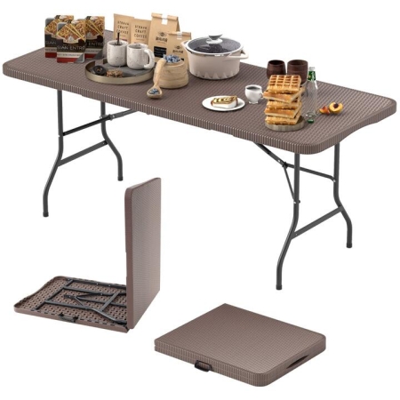 Experience outdoor dining at its best with this spacious folding table. Made from premium HDPE material, the 4 cm thickened tabletop withstands long-time outdoor use. Measuring 180 x 74 cm, the table comfortably seats up to 8 people, which is perfect for family or friend gatherings. Moreover, the table is supported by heavy-duty metal legs, ensuring stability and 160 kg load capacity. For easy storage and transport, it folds securely with safety locks. The versatility extends from picnics to kitchen use, making it an ideal addition to any setting. Enhance your outdoor gatherings with this reliable folding table, designed for convenience and longevity. Bullet Point: Premium HDPE Material: The patio table boasts a weatherproof HDPE tabletop which is sunproof, waterproof and anti-fading for long-lasting outdoor use. Moreover, the honeycomb construction on the back of the tabletop ensures higher stability.180 x 74cm Large Tabletop: The spacious 180 x 74 cm tabletop provides generous space for dining, working, or socializing, ensuring everyone has enough room for their dishes and drinks. Additionally, the rattan-like texture of the table surface brings more elegance.Heavy-Duty Metal Legs: Reinforced with robust metal legs which is well-coated, anti-deformation and super sturdy, this folding table features 160 kg max load. Additionally, the anti-slip footpads make the table stand more stably. Secure Folding and Expanding: Equipped with a safety lock and joint locks, the table folds in half with high security for easy storage and transport. This portable folding table with 11 kg net weight will provide much convenience for you.Versatile Folding Table: With high functionality, this patio table meets multiple demands for relaxation, whether for picnic, camping, kitchen or study. The convenient carrying handle makes it easy to move around wherever needed. Overall dimension: 180 x 74 x 75 cm (L x W x H). Folding dimension: 90 x74 x 8 cm (L x W x Thickness). Note: The table is slightly raised in the middle to prevent heavy objects from depressing the tabletop. Specifications: Colour: CoffeeMaterial: HDPE, MetalOverall Dimension: 180 x 74 x 75 cm (L x W x H)Folding Dimension: 90 x74 x 8 cm (L x W x Thickness)Weight Capacity: 160 kgNet Weight: 11 kg Package Includes:1 x Folding Table1 x Instruction Box Qty:1(May vary by batch)