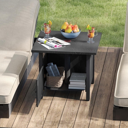 This umbrella base table boasts a sturdy zinc-iron alloy structure with adjustable foot pads, ensuring stability on uneven terrains. Equipped with a practical 48 mm umbrella hole and an adjustable fixing screw, this small patio end table accommodates most standard patio umbrellas (not included). Furthermore, the integrated umbrella stand table comes with 2 sand bags that each hold up to 10 kg, offering extra stability and additional inner storage space through a cleverly designed front door, making it an ideal addition to your garden, deck or poolside lounging area. Note: 1)The sand is not included. 2)The patio umbrella is not included. Bullet Point: Sturdy Construction: This pool side table features a robust zinc-iron alloy structure, providing a stable surface for your drinks and snacks. Additionally, the adjustable foot pads ensure extra stability on uneven surfaces. Built-in Umbrella Hole: With a 48 mm umbrella hole and an adjustable fixing screw, this outdoor side table accommodates most standard patio umbrellas (not included) to create a comfortable outdoor retreat. Extra Stability and Storage: The included 2 sand bags can each uphold 10 kg of sand (not included), which enhances the stability of this umbrella table. Plus, the front door allows you to put sand bags easily while offering additional storage space. Rustic Charm: The wood-like surface of this patio table with umbrella hole adds a rustic charm to your outdoor space. Moreover, the included umbrella hole cap creates a smooth surface, perfect for safely placing drinks or decorative items. Wide Application: Whether it's set beside wicker furniture in your garden or between 2 patio recliners by your poolside, this umbrella stand table serves as a versatile and essential component of your outdoors. Please avoid rain exposure for prolonged service life. Specifications: Colour: Black Material: Zinc-iron Alloy Overall Dimensions: 56 x 56 x 48 cm (L x W x H) Inner Diameter of Umbrella Hole: 48 mm Net Weight: 10 kg Weight Capacity: 80 kg Sand Capacity per Bag: 10 kg Box QTY: 1 (May vary by batch) Package Includes: 1 x Umbrella Table 2 x Sand Bags 1 x Instruction Manual