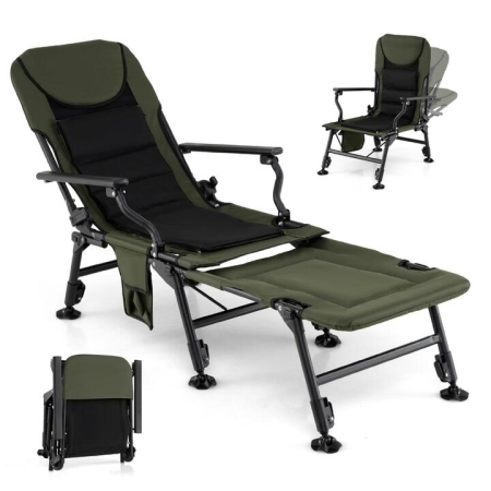 Our 2-in-1 versatile recliner chair with a footrest is equipped with 360° swivel feet and legs that can be adjusted in height, ensuring a firm, anti-slip foundation whether you're on grass, gravel, or uneven ground. Thoughtful features like a 5-level adjustable backrest and detachable footrest let you switch easily between sitting upright, reclining back, or lying down for a quick rest. The wide seat is generously padded and comes with an integrated pillow and smooth armrests, so you can personalize your comfort, while the backrest's removable cushion offers breathable mesh for hot days and cozy warmth for cooler outings, suitable for summer and winter. Built from thick 600D Oxford cloth and a robust metal frame, this chair combines lasting durability with impressive load-bearing strength. Effortless to fold and convenient to transport, it's the perfect companion for fishing trips, camping weekends, travel, or any outdoor adventure where all-day comfort matters. Adapt to Various Terrains: Featuring 360° swivel feet and 0-14 cm Height-adjustable Legs, this all-terrain chair ensures remarkable stability on a wide range of surfaces, including lawn, gravel, asphalt, and mud. It could effectively prevent sinking or slipping, so you can stay relaxed and steady wherever your adventure takes you. Adjustable Design: This oversized camping chair a 5-level adjustable backrest for customized support, allowing seamless transitions between sitting, reclining, or lying flat. Moreover, with a detachable footrest, it offers a 2-in-1 multi-function setup for different outdoor scenarios. Customizable Comfort: This folding camping chair is filled with soft padding, paired with an integrated pillow and smooth armrests, providing cushioned support for ultimate relaxation. Plus, the detachable zippered cushion on the backrest allows for breathable mesh exposure in summer or plush warmth in winter, giving you a cozy or airy seat tailored to the season. Stable & Reliable Construction: Crafted with thick 600D Oxford cloth known for its good tensile strength and wear resistance, combined with a robust metal frame, this oversized fishing chair supports up to 150 kg, giving you unmatched reliability during long outdoor sessions. Foldable & Portable Design: The lounge chair is easy to fold for hassle-free storage and transport, which easily fits into your car trunk or storage area. Perfect for fishing, camping, beach parties, RV travel, or picnics, this chair goes wherever you go, providing both comfort and convenience for all your outdoor adventures. Specification:Color: GreenMaterial: 600D Oxford Cloth, Sponge, MetalChair Size in the Sitting Mode: 60 x 117 x 90 cm (L x W x H)Chair Size in the Lying Mode: 60 x 166 x 46 cm (L x W x H)Seat Size: 47 x 46 cm (L x W)Seat Height: 32 cmFootrest Size: 47 x 60 cm (L x W)Folding Size: 60 x 20 x 63 cm (L x W x H)Weight Capacity: 150 kgNet Weight: 7.5 kgBox QTY: 1(May vary by batch)Is Assembly Required: Yes Package Includes:1 x Folding Fishing Chair1 x User’s Manual