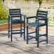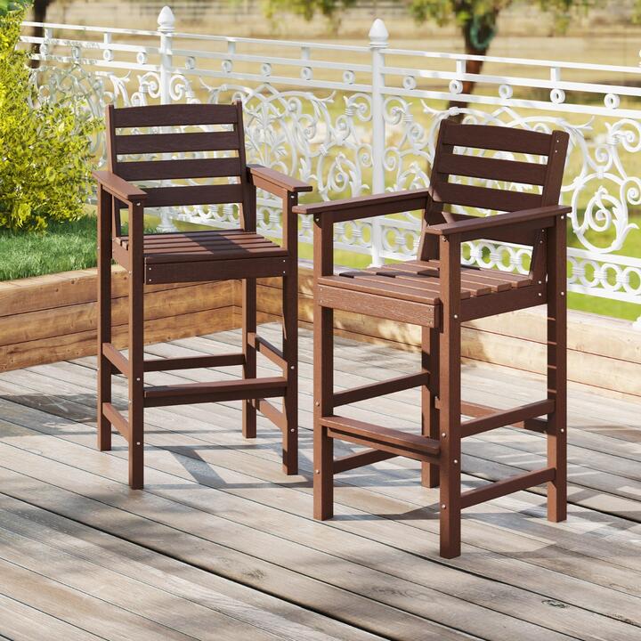 The 2 bar chairs are meticulously crafted from all-weather HDPE material and equipped with robust stainless steel screws, ensuring high stability and extended outdoor use. Each seat features a 105° inclined backrest, 8 cm wide armrests, and a 6.5 cm wide footrest, so you won't feel tired after long-time sitting. The faux wood texture and classic Adirondack design add an element of sophistication to any outdoor setting, making these high-top chairs perfect for use alongside 100 cm to 115 cm high bar tables. These 2 bar chairs with well-crafted details will elevate your outdoor spaces with both style and ease. Bullet Point: Superior Material Quality: Crafted from all-weather HDPE material, these Adirondack bar chairs are waterproof, sunproof and anti-fading, ensuring ongoing charm for your outdoor spaces. And the stainless steel screws further prolongs the service life. Ultimate Coziness: Built with a 105° inclined backrest, the patio bar chairs offer comfortable support. Moreover, 8 cm wide armrests and 6.5 cm wide footrest are designed for supreme relaxation and reduced fatigue. Stylish and Classic Appearance: Combining the timeless charm of Adirondack styling, these bar height chairs present a sophisticated yet traditional look with a faux wood texture that boosts outdoor aesthetics. Versatile Outdoor Solution: These bar stools are an excellent choice for any outdoor environment, from gardens to poolside or patio settings, ideally complemented by 100 cm to 115 cm high bar tables. Easy to Maintain: Designed for ease of care, these bar chairs with slatted seat and back can be quickly cleaned with a damp cloth, allowing you more leisure time with minimal upkeep efforts. Overall dimension: 65 x 60 x 116 cm (L x W x H). Specifications: Color: Brown/Black/Gray/NavyMaterial: HDPE, Stainless SteelOverall Dimension: 65 x 60 x 116 cm (L x W x H)Seat Height: 73 cmFootrest Height: 31 cmWeight Capacity: 150 kgSuitable Table Height: 100-115 cmTotal Net Weight: 32.5 kg Package Includes:2 x Patio Bar Chairs1 x Instruction Manual Box Qty:1(May vary by batch)