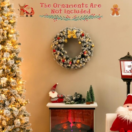 Combining the elegance of 65 snow-flocked leaves with the vibrancy of 8 snow-flocked pine cones, the pre-lit wreath sets a vivid backdrop for any space. Plus, the hoop of the lighted Xmas wreath is crafted with natural rattan to offer a blend of authenticity. The addition of 35 warm white LED lights further enhances the ambiance. With 6 lighting modes to choose from(constant, flash, slow fade, timer constant, timer flash and timer slow fade), the battery operated wreath caters to a variety of occasions. Additionally, the timer function ensures convenience by keeping the lights on for 6 hours and then automatically turning them off for 18 hours. Crafted from PVC and PE materials, the hoop wreath is also flame-retardant and smell-free. With convenient hanging design, the hoop wreath can easily bring festival cheer to everywhere, such as windows, walls, doors, fireplaces. Bullet Points: Lifelike and Exquisite Appearance: The pre-lit wreath boasts snow-flocked design and 65 branch tips to capture the spirit of the winter season. Moreover, the 8 pines cones in 2 different styles and rattan hoop create a picturesque backdrop that instantly elevates any space. Battery Powered Lights: With 35 warm white LED lights, the hoop wreath will increase the festival vibe. Moreover, 6 changeable lighting modes can suit any occasion. The battery-operated feature adds convenience, while the timer function automatically switches the lights on for 6 hours and off for 18 hours. Premium Materials: The faux Xmas wreath is crafted from high-quality PVC and PE materials, which are anti-fading for lasting beauty. Additionally, the flame-retardant and smell-free materials ensure safe indoor and outdoor decoration. Compact Hanging Design: Thanks to the included hanger and cordless design, the artificial holiday wreath can be easily displayed on windows, walls, doors, or fireplaces, bringing festive cheer to any corner of your space. Also, the hanging direction of the garland can be adjusted at will. Perfect for Any Occasion: Measuring 61 cm, the pre-lit Christmas wreath is suitable for a wide range of occasions. Whether you're looking to enhance your Christmas decorations, host a party, or surprise someone with a thoughtful gift, the wreath is the ideal choice. Features: Snow-flocked leaves add wintry atmosphere 2 types of snow flocked pine cones create a vivid and attractive appearance Natural rattan showcases a rustic style 35 warm white LED lights bring festival joy to every corner 6 lighting modes meet the needs of different occasions With timer, the lights will keep 6 hours on and 18 hours off Premium PVC and PE materials are flame-retardant and non-allergic A hanger is provided for convenient wall or front door hanging Powered by battery box and 3 AA batteries are required (not included) Specifications: Colour: White and Green Material: PE, PVC, Rattan Overall Diameter: 61 cm Number of Branch Tips: 65 Number of Pine Cones: 8 Number of LED Lights: 35 Net Weight: 1 kg Package Includes: 1 x Pre-lit Christmas Wreath Box Qty:1(May vary by batch) Is Assembly Required: Yes